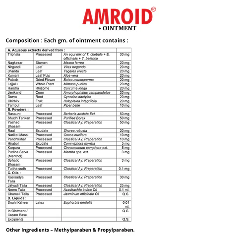 Amroid Ointment acts as haemostatic, anti-inflammatory and it eases the discomfort of piles (hemorrhoids). It is useful in conditions like bleeding piles, non-bleeding piles, inflamed piles, colitis, chronic constipation and allied complications.