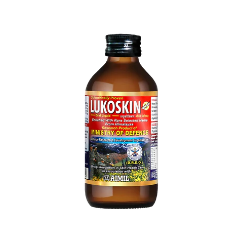 Lukoskin Liquid is a polyherbal formulation that is beneficial for skin conditions. This tonic may help restore normal skin pigmentation by improving melanin synthesis. The formulation is developed by the Defence Institute of Bio-Energy and Research, a wing of the Defence Research and Development Organisation (DRDO).