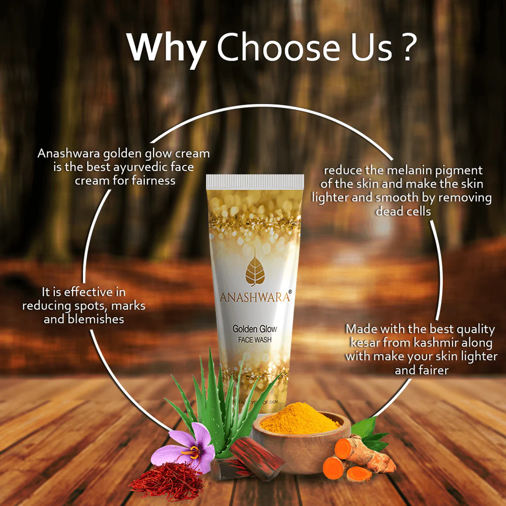 Anashwara Golden Glow Face Wash for Glowing Skin The proportion of melanin pigment in the skin varies from place to place and in climatic conditions. The sun rays and environmental elements enhance the melanin content in the skin resulting in a darker skin tone. Golden Glow Herbal Face Wash contains saffron and other potent herbal extracts that reduce the melanin pigment of the skin and make the skin lighter and smooth by removing dead cells. Golden Glow Face Wash Benefits