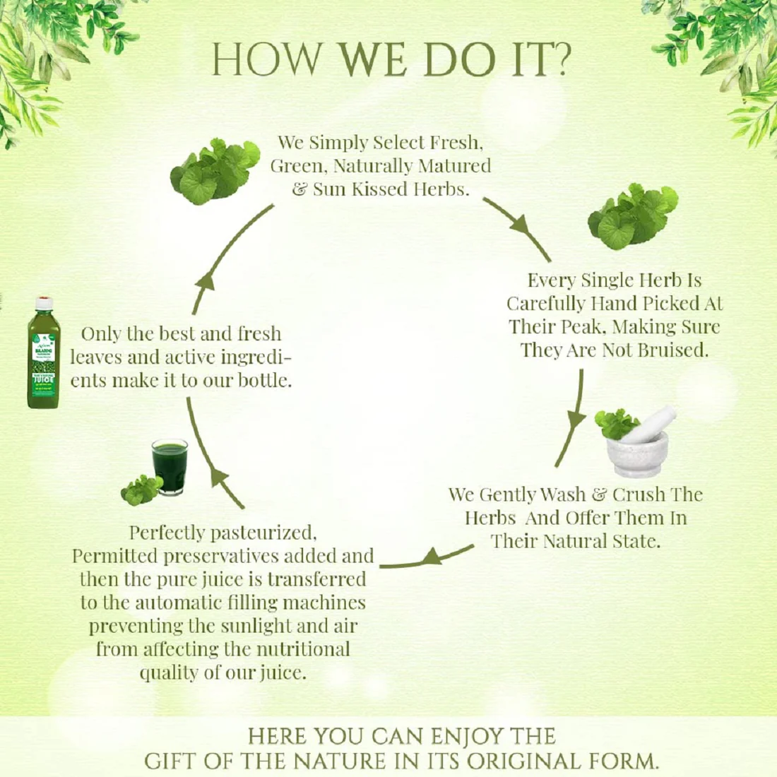 We select fresh, green, naturally matured, sun-kissed herbs, Every herb is carefully hand-picked at its peak making sure it’s not bruised. We gently wash, crush, and press them with nothing added and taken away as we want them to be as nature offered. Then the pure juice is transferred to the automatic filling machines preventing the sunlight and air from affecting the nutritional quality of our juice. Hence you can enjoy the gift of nature in its original form.