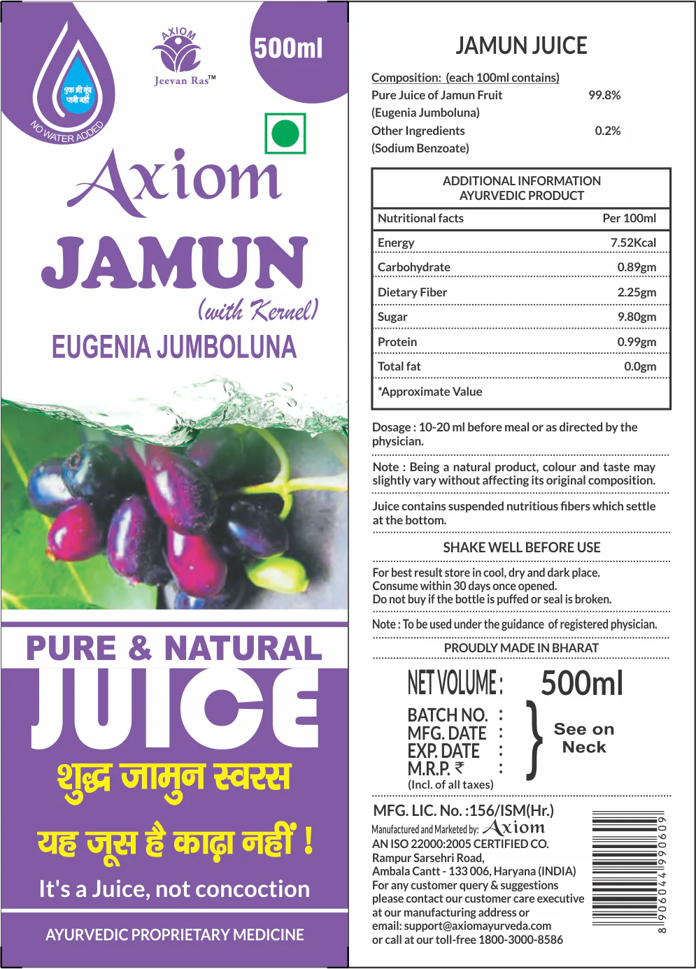 SUGAR-FREE WELLNESS: Enjoy the benefits of Axiom Jeevan Ras Jamun Juice without worrying about added sugars, making it a guilt-free addition to your daily wellness regimen.