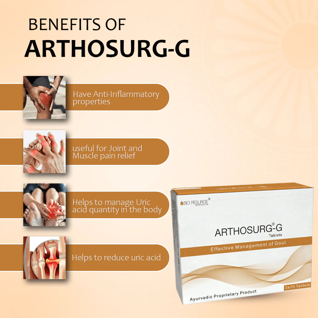 Arthosurg-G | Effective Gout Pain Relief Arthosurg helps to reduce inflammation and manages healthy levels of uric acid in the body. Key Benefits Have Anti-Inflammatory properties useful for Joint and Muscle pain relief Helps manage Uric acid in the body Helps to reduce uric acid