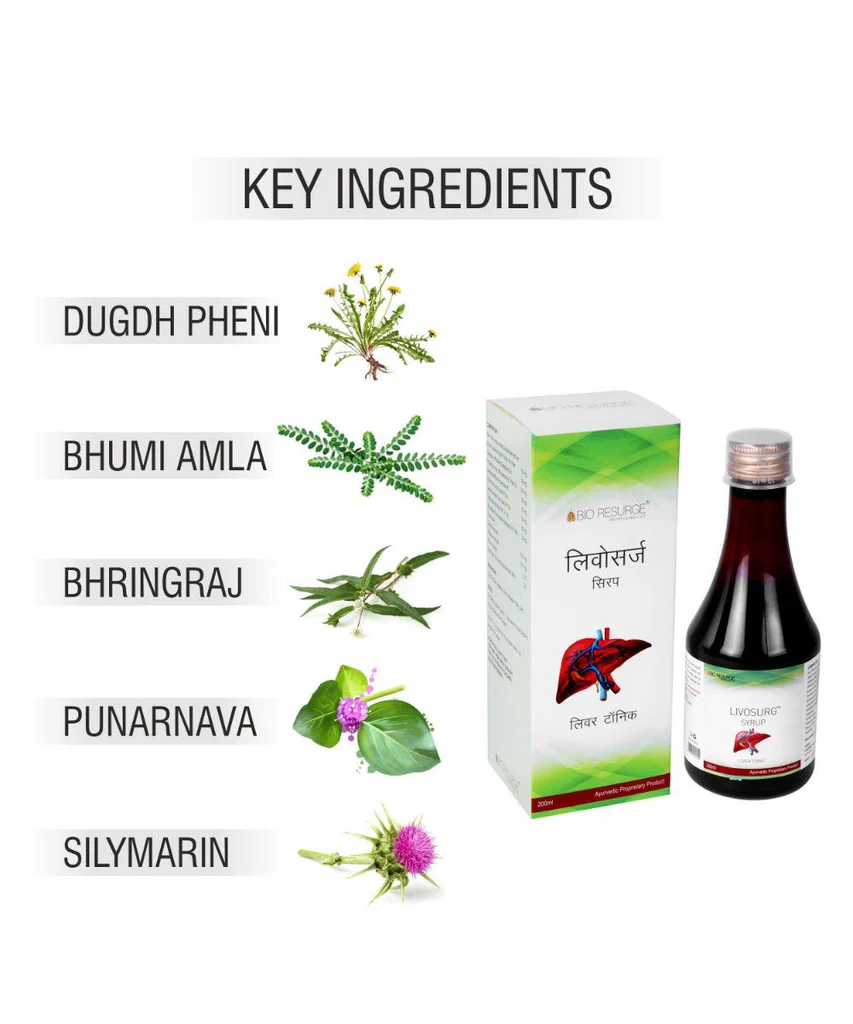 Livosurg - The best Ayurvedic liver syrup is a combination of natural herbs that protects the liver cells from external toxins, regulates liver enzymes, and also improves appetite and digestion. Key Benefits Regulates Liver Functions Helpful for Fatty Liver Helps improve Appetite Ayurvedic Liver Tonic to Detox Liver