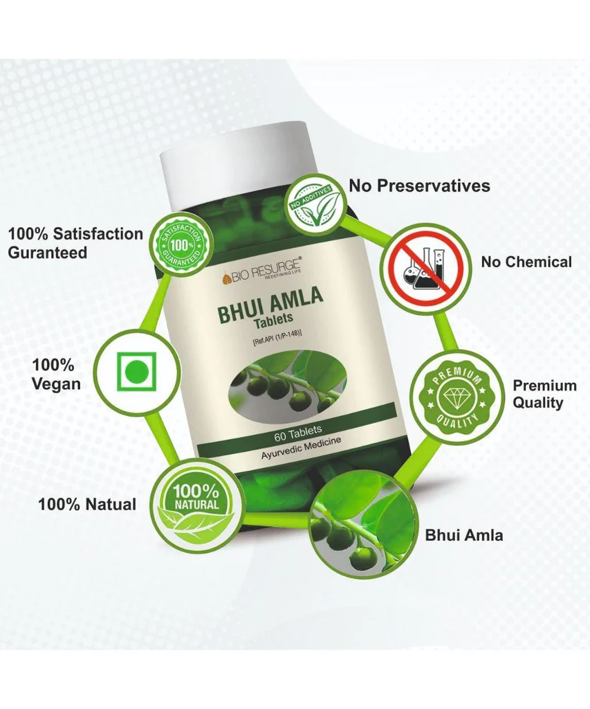 Key Benefits Helpful in liver cleanse Helpful to flush Liver Toxins & improve digestion Bhumi Amla is often used to augment Respiratory Health Helps to regulate healthy Blood Sugar levels Bhumi Amla supports Kidney Functions Have anti-inflammatory properties Bhumi Amla helps to balance Pitta Dosha Bhumi Amla has anti-viral properties Directions for Use Take 1-2 tablets twice daily or as directed by the physician.