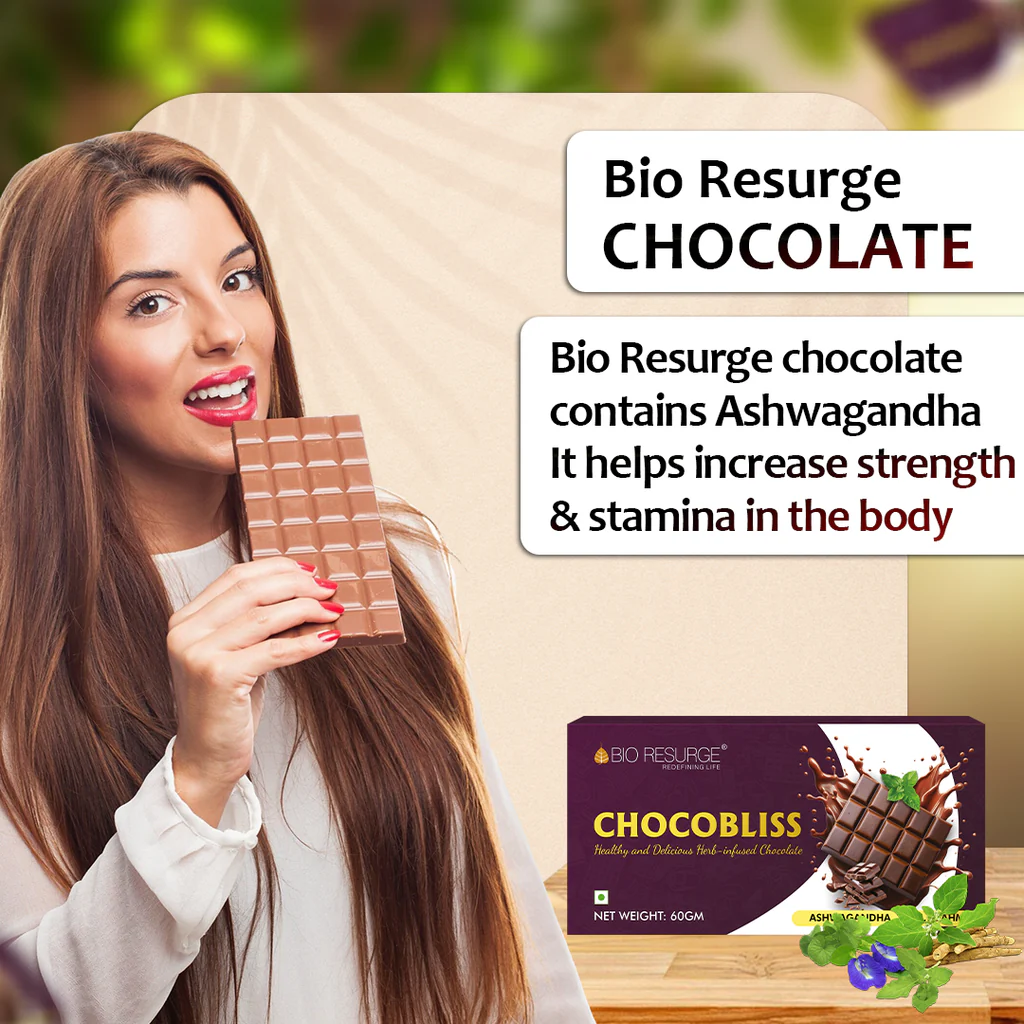 Bio Resurge Chocolate Increasing Strength and Stamina in The Body It is a unique concept as one can Indulge in it without Guilt. Bio Resurge chocolate contains Ashwagandha: It helps increase strength and stamina in the body and height. Make Bio Resurge Chocolate your regular habit. It does not contain added sugar.