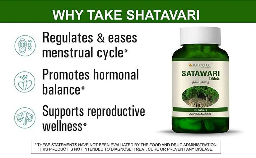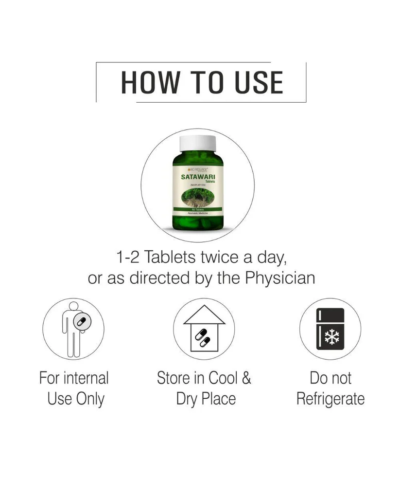 Shatawari Benefits: Shatawari is used for balancing hormones. Helps to improve female reproductive health Shatawari reduces symptoms of menopause Shatawari has anti-oxidant properties Helps in Lowering blood sugar levels Shatavar helps to improve gastric ulcers Direction for use: 1-2 tablets daily or as directed by your physician.