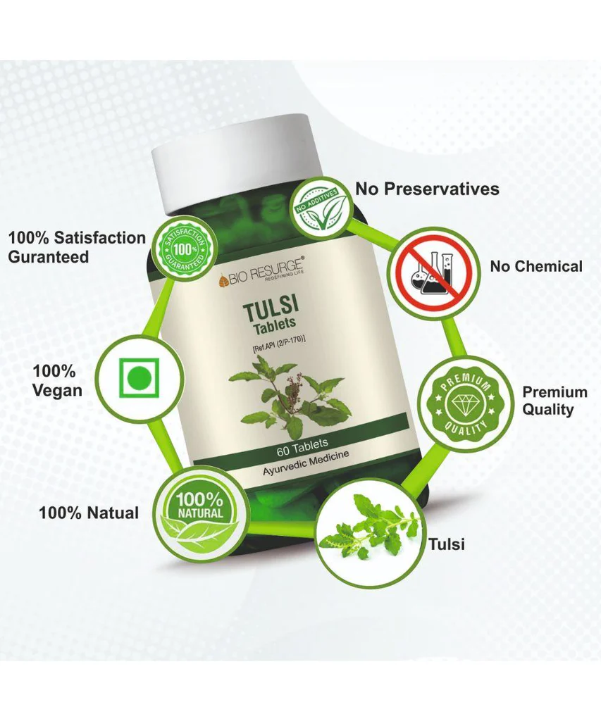 Bio Resurge Natural Tulsi Tablets | Boost your Immunity Tulsi is an aromatic shrub in the basil family that is believed to penetrate the deep tissues, dry tissue secretions, and normalize Vata and Kapha. Daily consumption of tulsi is said to prevent disease, promote general health, well-being and longevity, and assist in dealing with the stresses of daily life. Key Benefits Helpful in managing heart health Helps to regulate healthy Blood Sugar levels Helps to manage Anxeity Tulsi helps to balance Vata and Kapha Dosha Tulsi have anti-viral properties