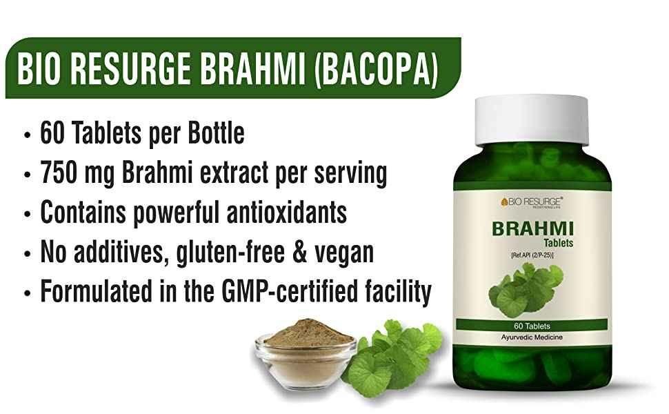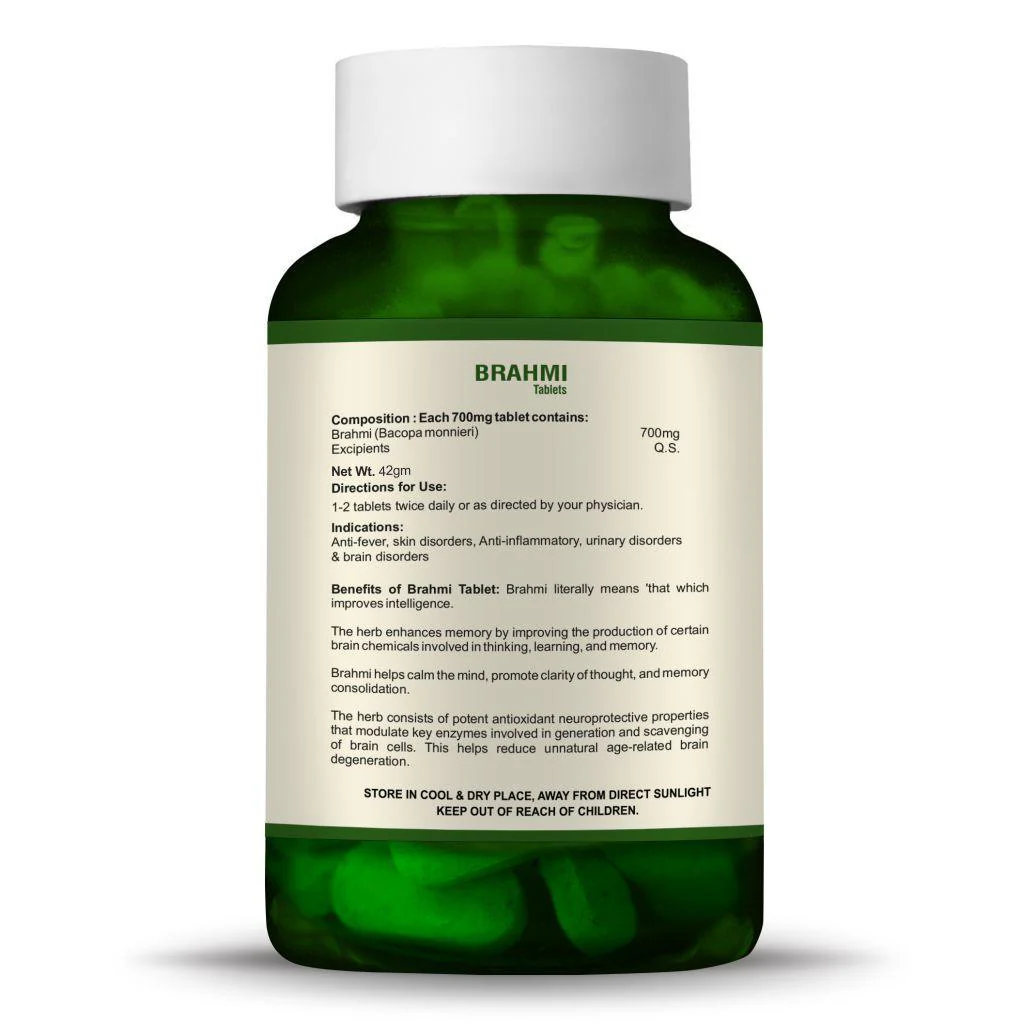 Key Benefits Brahmi benefits for the brain Improve liver functions Brahmi helps with internal swelling Contains powerful antioxidants Directions for Use: 1-2 tablets twice daily or as directed by your physician.