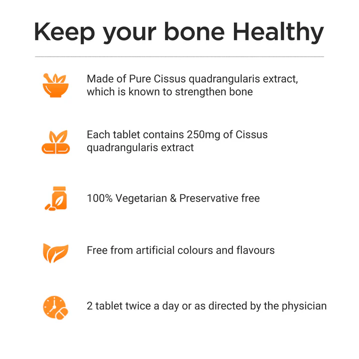 Hadjod accelerates the healing of fractures by supporting the delicate, healthy equilibrium between bone restoration and bone formation. INGREDIENTS: Asthisamhara Additional information: Composition: Each tablet contains: Asthisamhara (Cissus quadrangularis) stem extract - 250 mg Good to Know: -100% vegetarian. -Free from sugar, artificial colors, artificial flavors, preservatives. Special Instructions: -It is advisable to consult your physician before you start using the product in these situations: 1.Pregnancy 2.Breastfeeding 3.In Conditions which require special medical care -Specific contraindications that have not been identified -Please consult your physician if symptoms persist. Directions for Use: 2 tablets twice daily or as directed by your physician.