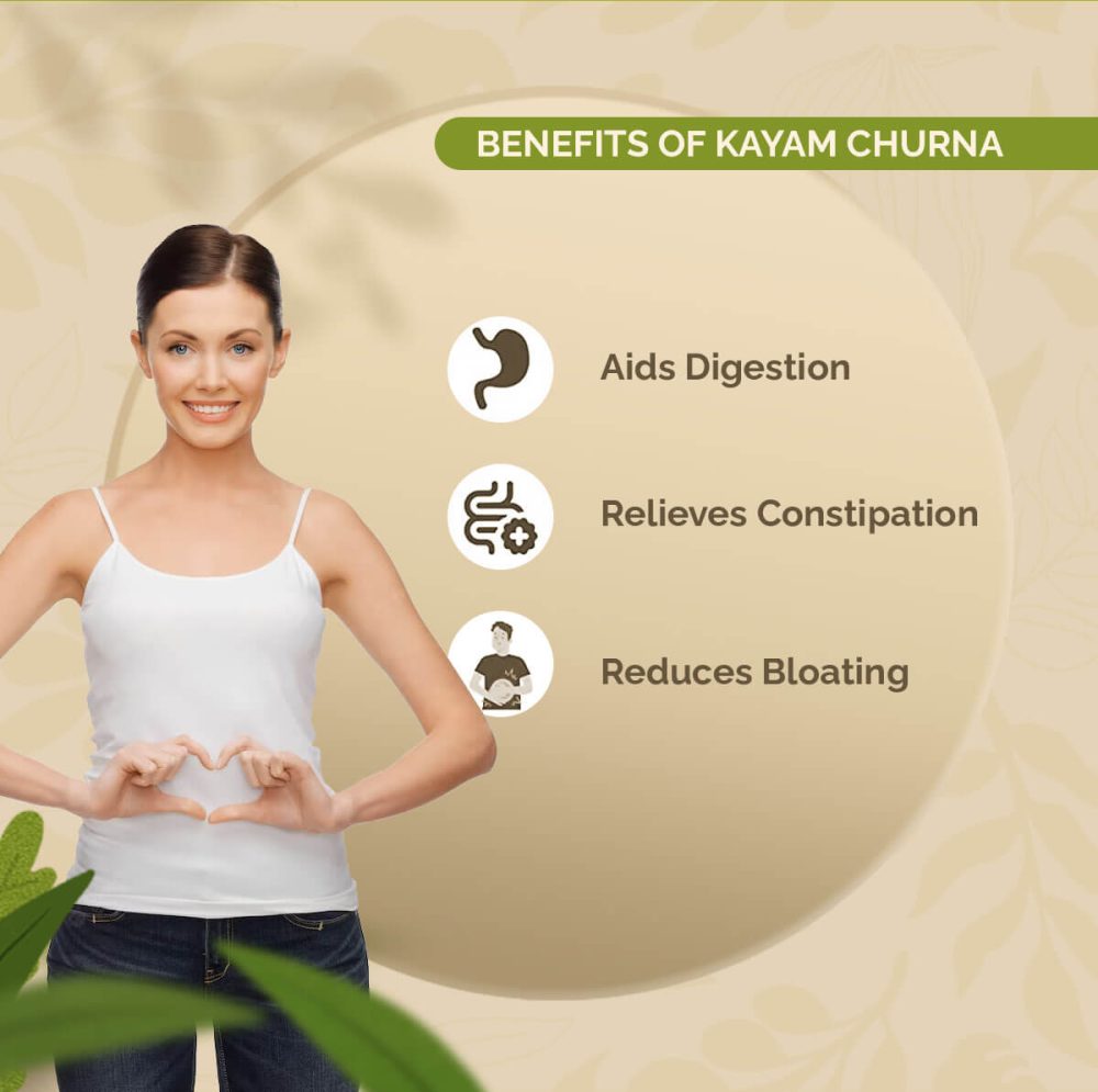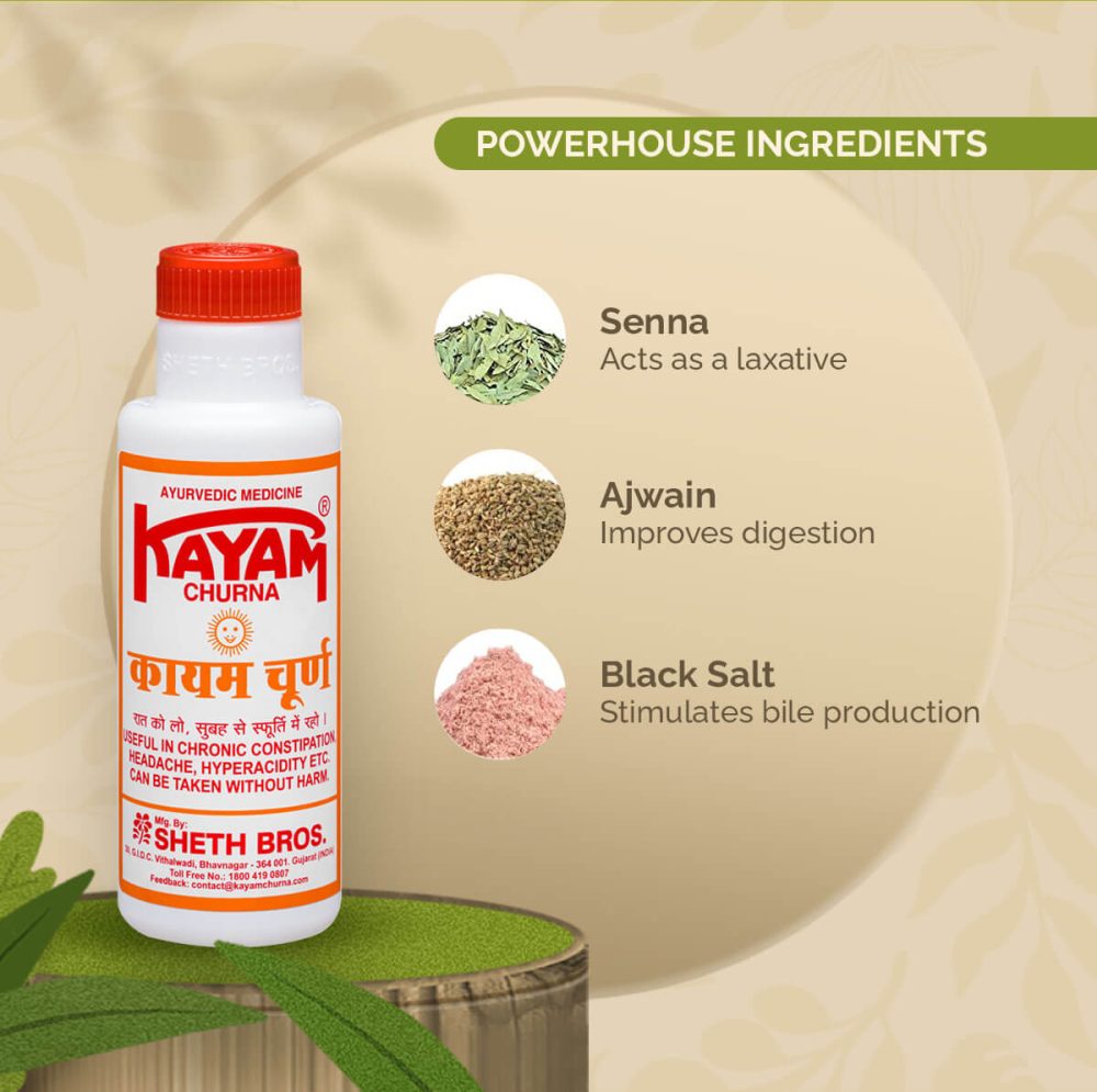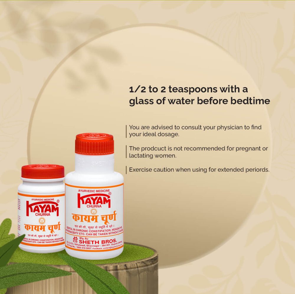 Kayam Churna is an Ayurvedic herbal formula which can help alleviate constipation and stomach problems. It may help manage chronic constipation, acidity, gas, and headaches. For the best results, take Kayam Churna before bed to get a clear stomach in the morning, keeping you fresh and healthy all day. It is an easy and natural solution to make your stomach feel light and keep you energetic in the morning. With its gentle action, it helps you start your day feeling refreshed and ready to go.