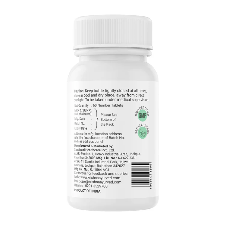 Dosage: 1 to 2g twice a day with warm water in morning & evening or as directed by the physician Foods to Avoid: Heavy, Oily & Spicy food. Diet: Light & easy to digest food Ashwagandha tablets are a popular Ayurvedic supplement derived from the Ashwagandha plant (Withania somnifera), also known as Indian ginseng or winter cherry. Ashwagandha tablet benefits include its ability to help increase muscle strength, boost body immunity, and reduce fatigue. In addition, Ashwagandha tablet from the plant's root helps the body cope with stress.