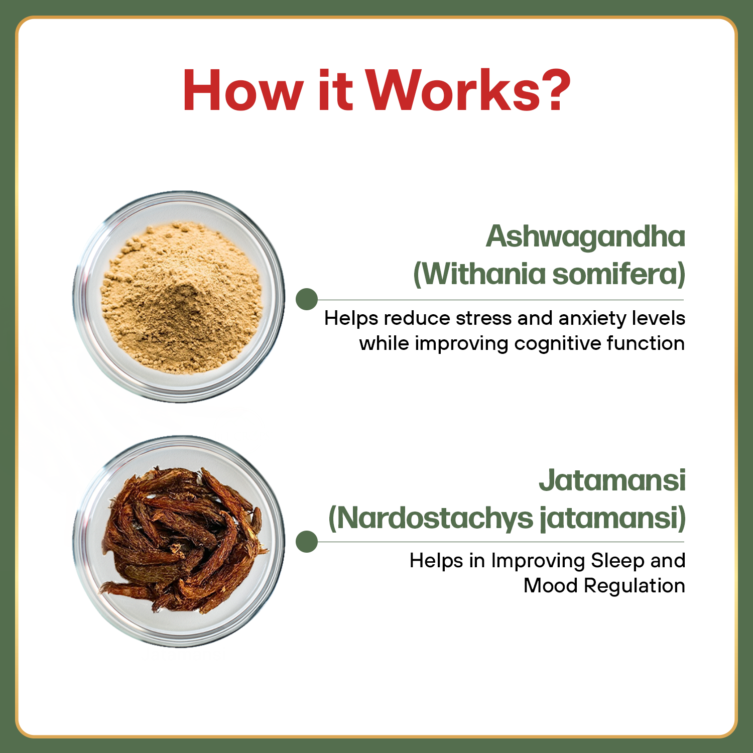The combination of ingredients offers several health benefits: Helps reduce stress, anxiety, and mental fatigue by potentially lowering cortisol levels. Increases stamina and energy, helping to combat general fatigue. Supports cognitive function, including improving focus and mental clarity. Promotes healthy immune function and hormonal balance. Aids in promoting sound sleep and relaxation. Has also been historically used in Ayurvedic practices for arthritis, constipation, and certain skin conditions. Directions for Use and Safety Dosage: It is generally recommended to take 2 capsules twice a day or as directed by a physician or Ayurvedic expert. Safety Information: Read the label carefully before use. Store in a cool, dry place away from direct sunlight. Keep out of reach of children. Pregnant or breastfeeding women should consult a medical professional before use. Individuals with autoimmune or thyroid disorders should also avoid this product or use under medical supervision.