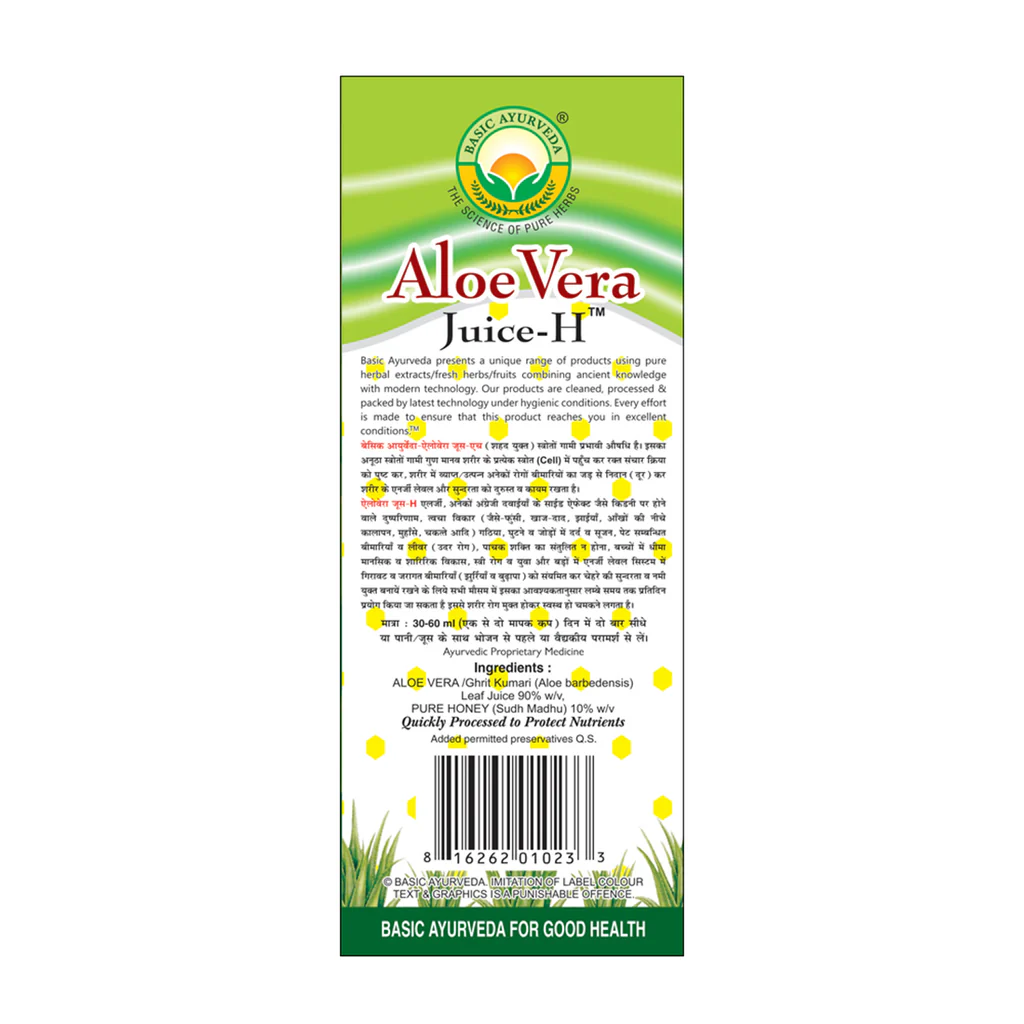 Basic Ayurveda Aloe Vera Juice With Honey | Basic Ayurveda's Aloe Vera Juice or Ghrit Kumari Ras (With Honey) is an Ayurvedic herb. Aloe Vera has been used for thousands of years in Ayurvedic practices to flush out toxins, improve digestion, control blood sugar, and build immunity. Basic Ayurveda Aloe Vera Juice has no added flavours or colours and it is . Improves Eye Health Improves Immunity Increases Energy Naturally Improve digestion Build immunity