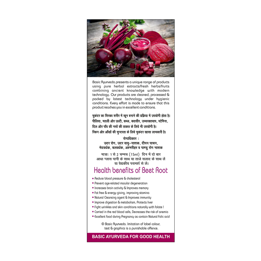 Beetroot (Beet Vulgaris), is an ayurvedic herb. Beetroot is a root vegetable also known as ‘Beet’ or ‘Chukunder’. It has recently gained popularity as a superfood due to the presence of essential nutrients such as folate, potassium, iron, and vitamin C.Beetroot is also rich in antioxidants that help promote the healthy functioning of the heart which therefore helps in the management of hypertension. Basic Ayurveda's Beetroot vintage is basically for stomach-related problems. It helps to remove bad cholesterol thus it is excellent for heart problems. It is a nutritious drink with a good taste. An all-healer with no side effects 1-2 teaspoons (15mL.) twice a day with half a glass of water or with fresh salad. Shake well before every use. Store in a cool and dark place.