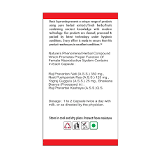 Irregular menstruation Restart menstruation if stopped due to some problem Improve uterus health Menorrhagia (Helpful in heavy menstruation) Dysmenorrhea (painful periods) Amenorrhea (No menstruation) Maintain healthy digestion and metabolism Useful in swelling Beneficial in fever Irregular menstrual cycles Uterine diseases (Womb diseases) Improve female sexual health Helpful in anemic condition 1-2 capsules twice a day with water or as directed by physicians.