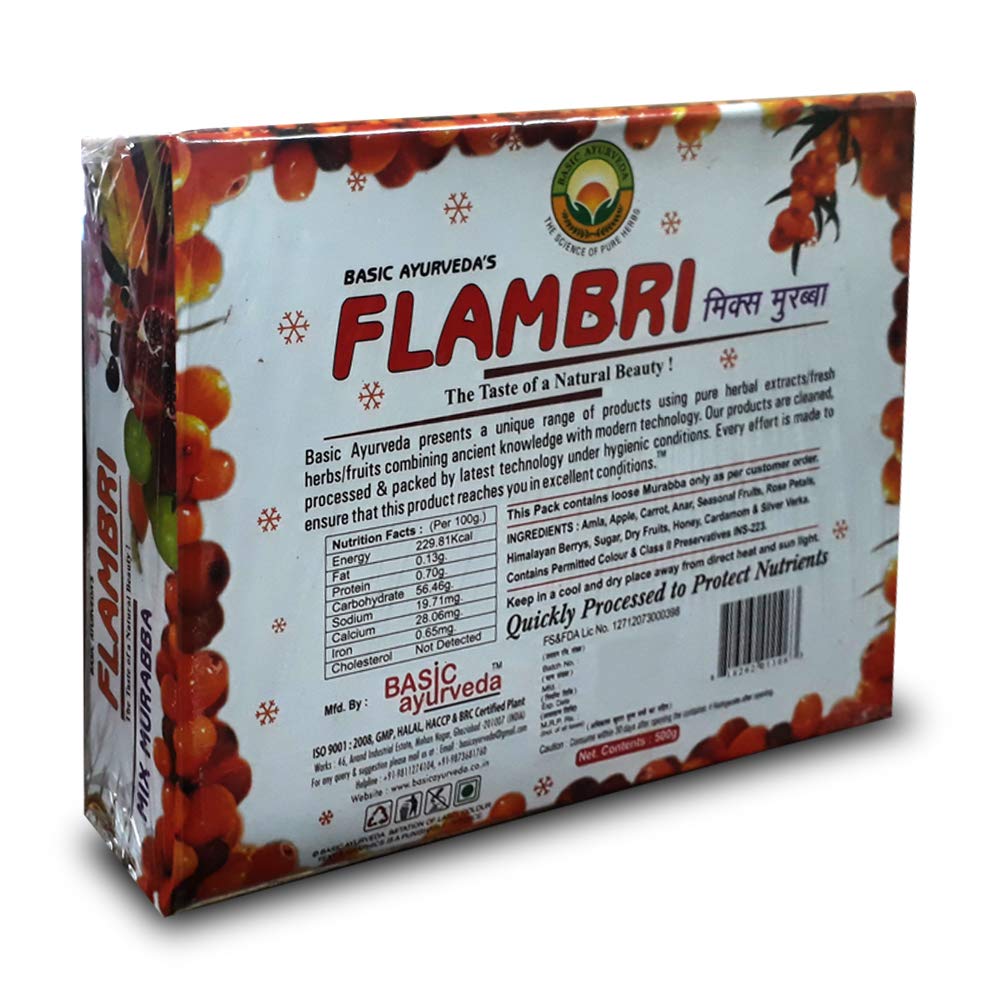 This Flambri Mix Murabba is made from grown ingredients and contains no added flavours or colours. It is cold-pressed to retain all its nutritional value." Immunity Booster - Due to its high antioxidant content, it helps fight against germs and helps strengthen your immune system. It is rich in Vitamin C, which protects against common cough. It helps control hair fall and promotes an overall healthy lifestyle. Regular intake of basic Ayurveda Flambri mix murabba in any form helps to rejuvenate the body and gives longevity. There are several health benefits of eating this mix murabba