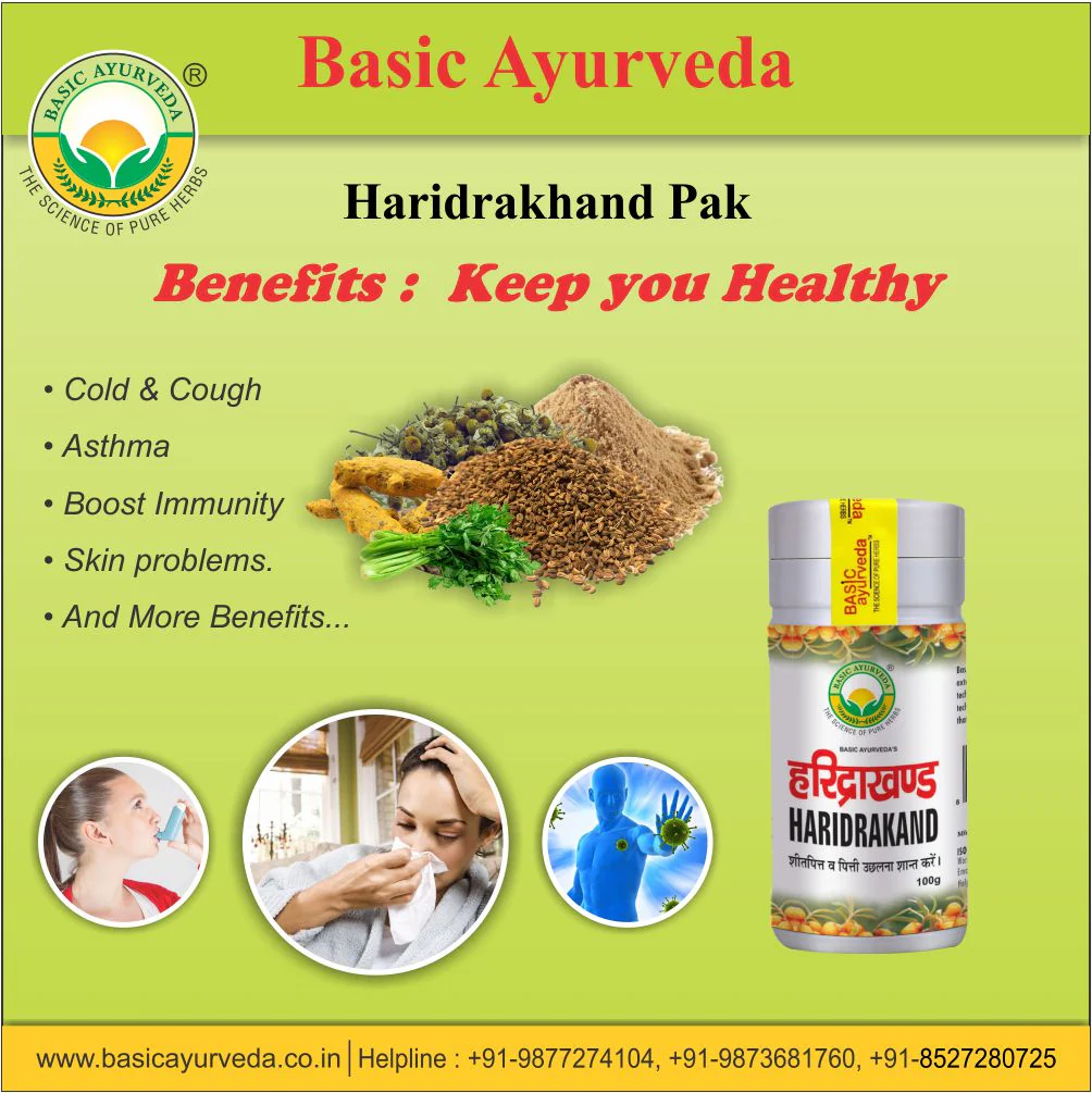 Basic Ayurveda's Haridrakand pak is an ayurvedic and herbal medicine used for skin diseases and allergies. Anti-Allergic Anti-Inflammatory Antioxidant Allergic Skin Rashes Beneficial In Asthma Cure Cold & Cough Chronic Fever Worm Infection Boost Immunity Good Antiseptic Blood Purifier