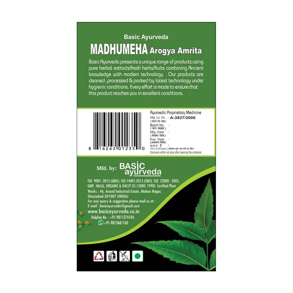 Basic Ayurveda Madhumeha Arogya Amrita is an ayurvedic formulation containing ingredients and helps control sugar. Control Blood Sugar Monitor Blood Sugar Level Regularly Strict Dietary control and regular exercise Standard delivered 4-5 Business Days Express delivered 2-4 Business Days