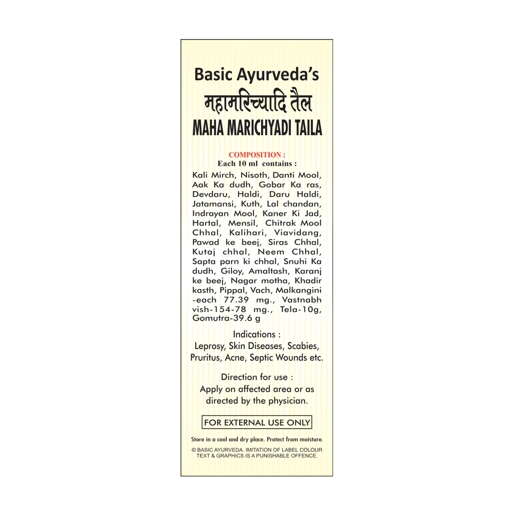 Basic Ayurveda’s Mahamarichyadi Tel is an herbal medicine that is beneficial and provides profits such as suggested in outer useful in leprosy and also suggested in skin diseases, scabies, pruritis, psoriasis, acne, septic wounds, etc. Psoriasis Useful in skin disease Itching Acne Septic wounds Ulcers Ringworm Eczema Scabies and other skin diseases Standard delivered 4-5 Business Days Express delivered 2-4 Business Days