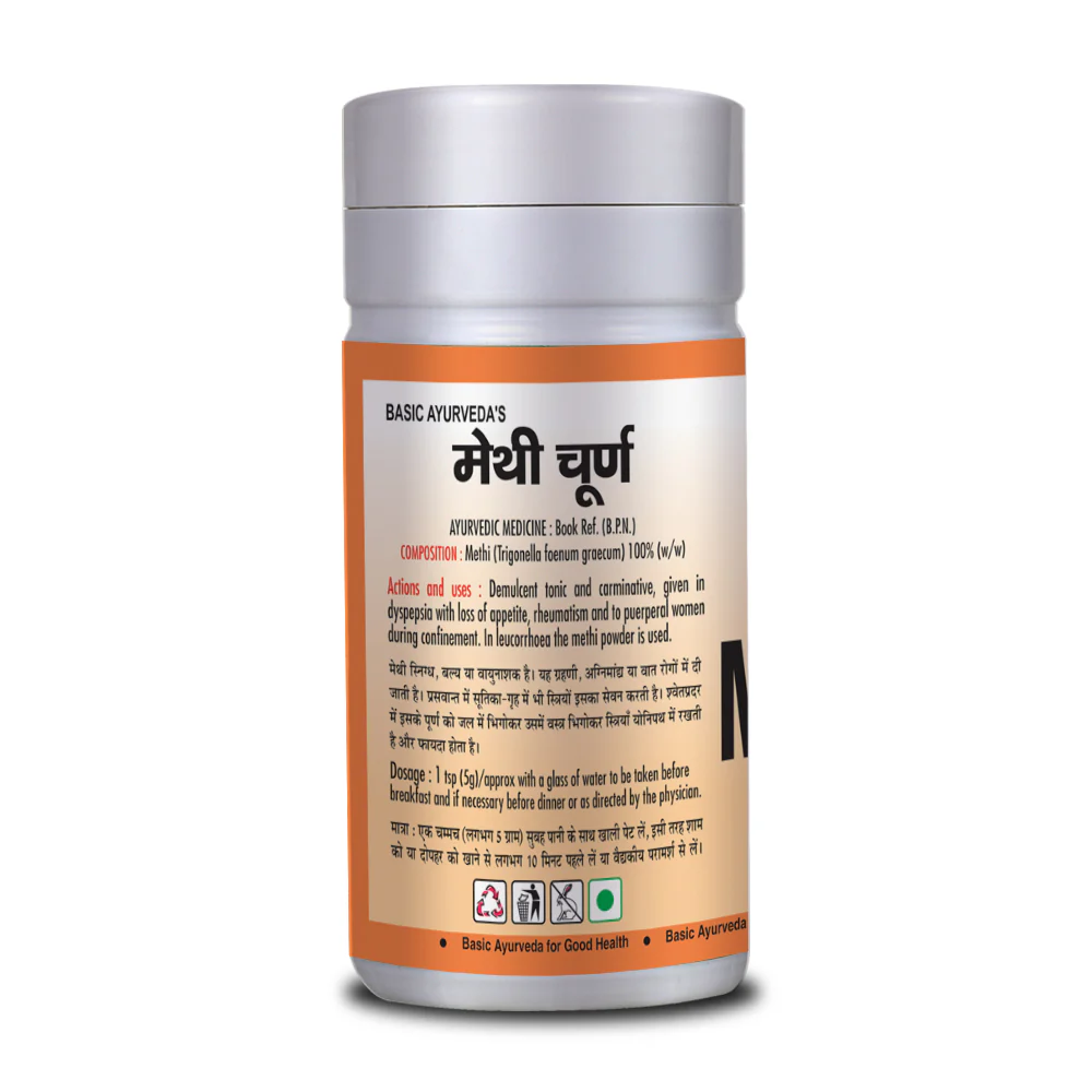 Basic Ayurveda Methi Powder contains methi(Trigonella foenum graecum) as its main ingredient. It is high in potassium and low in sodium. Therefore, can keep blood pressure under control and regulate heart rate efficiently. It is very effective in diabetic people. Enhanced Libido Better Digestion Clear Complexion Lower Cholesterol May Prevent Cancer Weight Loss Management Anti-Inflammatory Improve cardiovascular health Control blood pressure Maintain hormonal imbalance Repair Damage Hair Reduce Sign of Aging