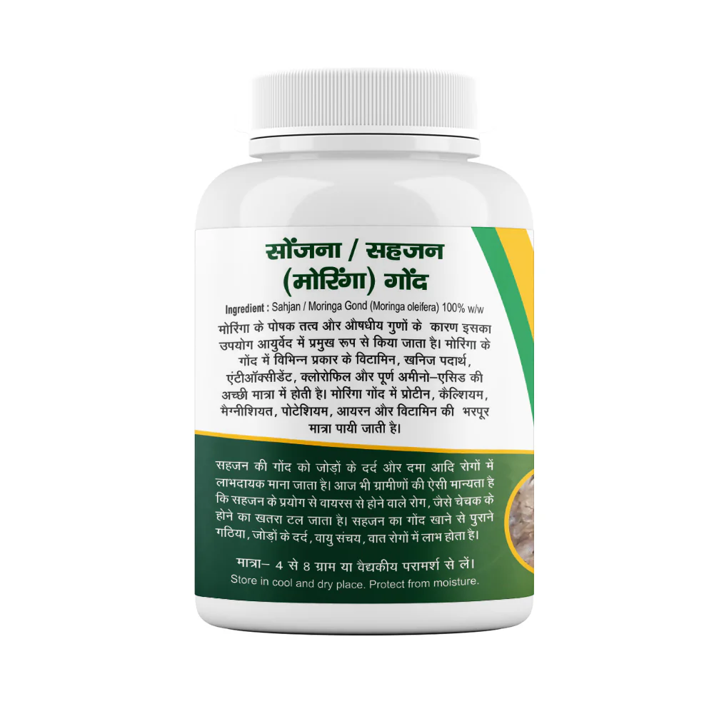 enefits: Due to the nutritional and medicinal properties of Moringa, it is mainly used in Ayurveda. Moringa gond contains a good amount of various vitamins, minerals, antioxidants, chlorophyll, and complete amino acids. Protein, calcium, magnesium in Moringa gond. Rich in potassium, iron, and vitamins. Joint pain Chronic Asthma Virus-related diseases (smallpox) Air accumulation Gout diseases