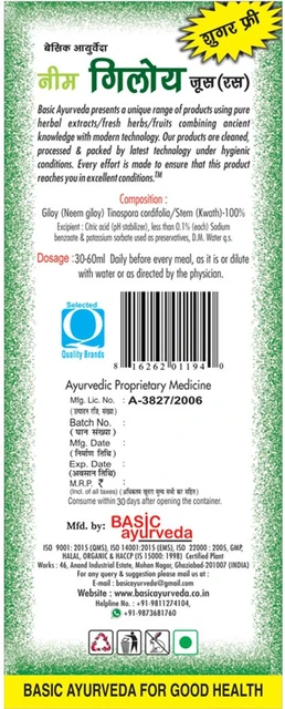 Basic Ayurveda Neem Giloy Juice (Ras) | Immune booster | Blood purifying | acne-free skin | General weakness | Basic Ayurveda Research & Development department produces safe, efficacious, and consistent herbal supplements. All Type of Fever Urine Burning Skin Disorder Flu & Cough Useful in Anemia Improve Appetite General weakness High Blood Sugar Liver Related Disorder (Jaundice) Helpful in Vomiting & Nausea Heart-Related Problem