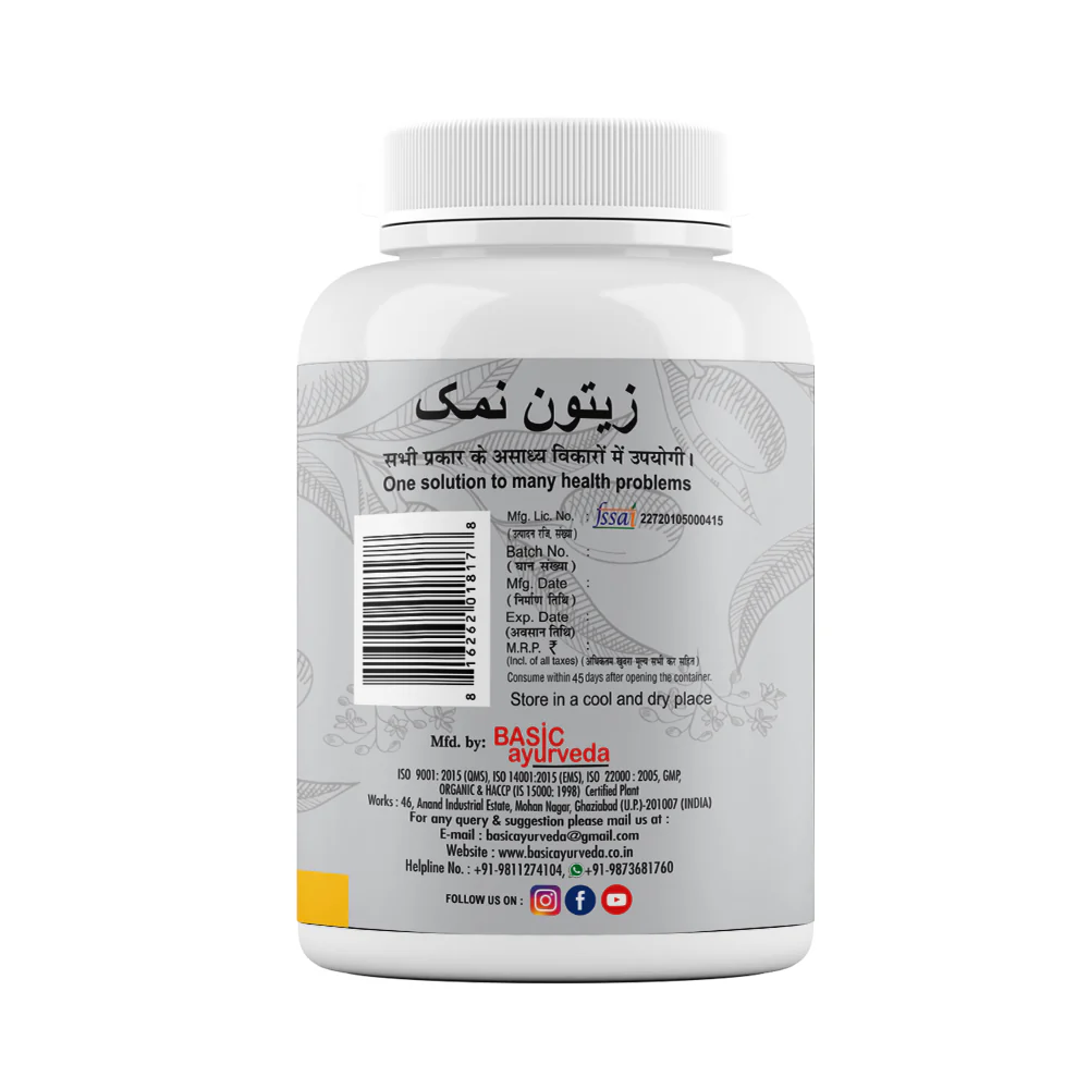 Benefits: Jaitoon Salt is an ideal treatment for different Diseases like Diabetes control, Digestion, Gastric related issue, Liver related issues, Kidney related issues, Hypertension, and cholesterol issue. Olives are a good source of vitamin E, iron, copper, and calcium. They may also contain high amounts of sodium if packaged in saltwater. Antioxidant properties Improved heart health High blood cholesterol Improved bone health May Fight Alzheimer’s Disease