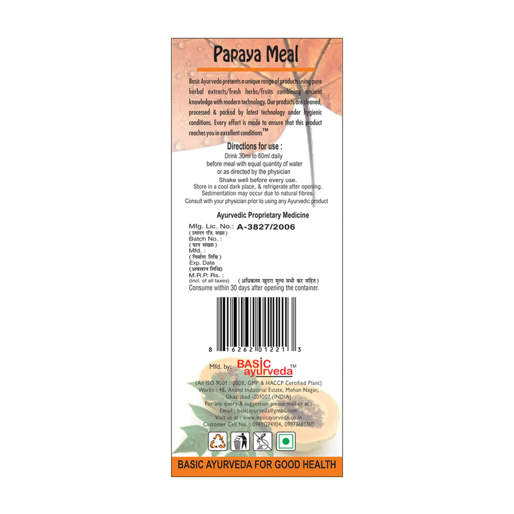 Papaya: The papaya is an incredibly healthy tropical fruit. It's loaded with antioxidants that can reduce inflammation, fight disease, and help keep you looking young. Delicious and Loaded With Nutrients Basic Ayurveda's added kali mirch in Papaya Meal Juice that is why its nutritional value became twice due to the presence of black pepper. It improves digestive fire and appetite and it helps to stimulate the digestive enzyme. No Artificial Sweeteners or colours are used in this juice. Basic Ayurveda's Papaya Meal is First Press Virgin Juice prepared with the help of fresh papaya pulp. Papaya is a tropical fruit, has a smooth texture and aromatic taste. It is particularly useful in diseases related to blood, constipation, and the heart. Papaya, also popularly known as the “The Fruit of the Angelsâ€. The delicious fruit rich in antioxidants, vitamins, and minerals provides incredibly high nutritional benefits. Health Benefits of Papaya Meal: Good Eye Health. Papayas are loaded with Vitamin A (antioxidants) and Vitamin C, which helps in improving eye health. Aids digestion. Anti-ageing. Boosts Immunity. Helps in weight loss. Better kidney health. Great for diabetics. Better cardiovascular health. It can increase the number of platelets, Helpful in, and stomach related problems.