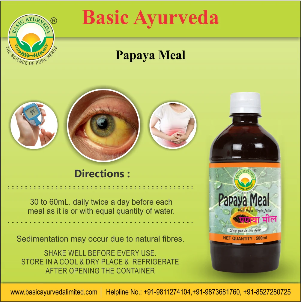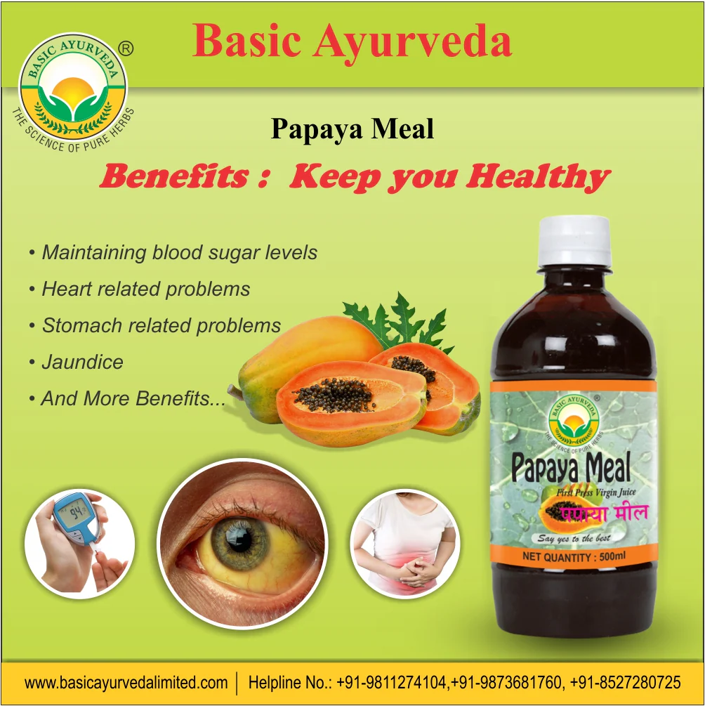 It is a nutritious drink with a good taste. Wellness Drink, No Artificial Sweeteners or colours Rich in. An all-natural healer with no side effects! 30 to 60 ml daily twice a day before each meal as it is or with an equal quantity of water Basic Ayurveda Papaya Meal Juice Beneficial in digestion | Helps in weight loss | It can Increase the number of platelets | Boosts Immunity | Basic Ayurveda Papaya Meal First Press Virgin Juice is an Ayurvedic herb. It can increase the number of platelets, Helpful with, constipation, and stomach related problems. Helpful for stomach related problems Helpful for heart-related problems Helpful for Jaundice It can help in maintaining blood sugar levels