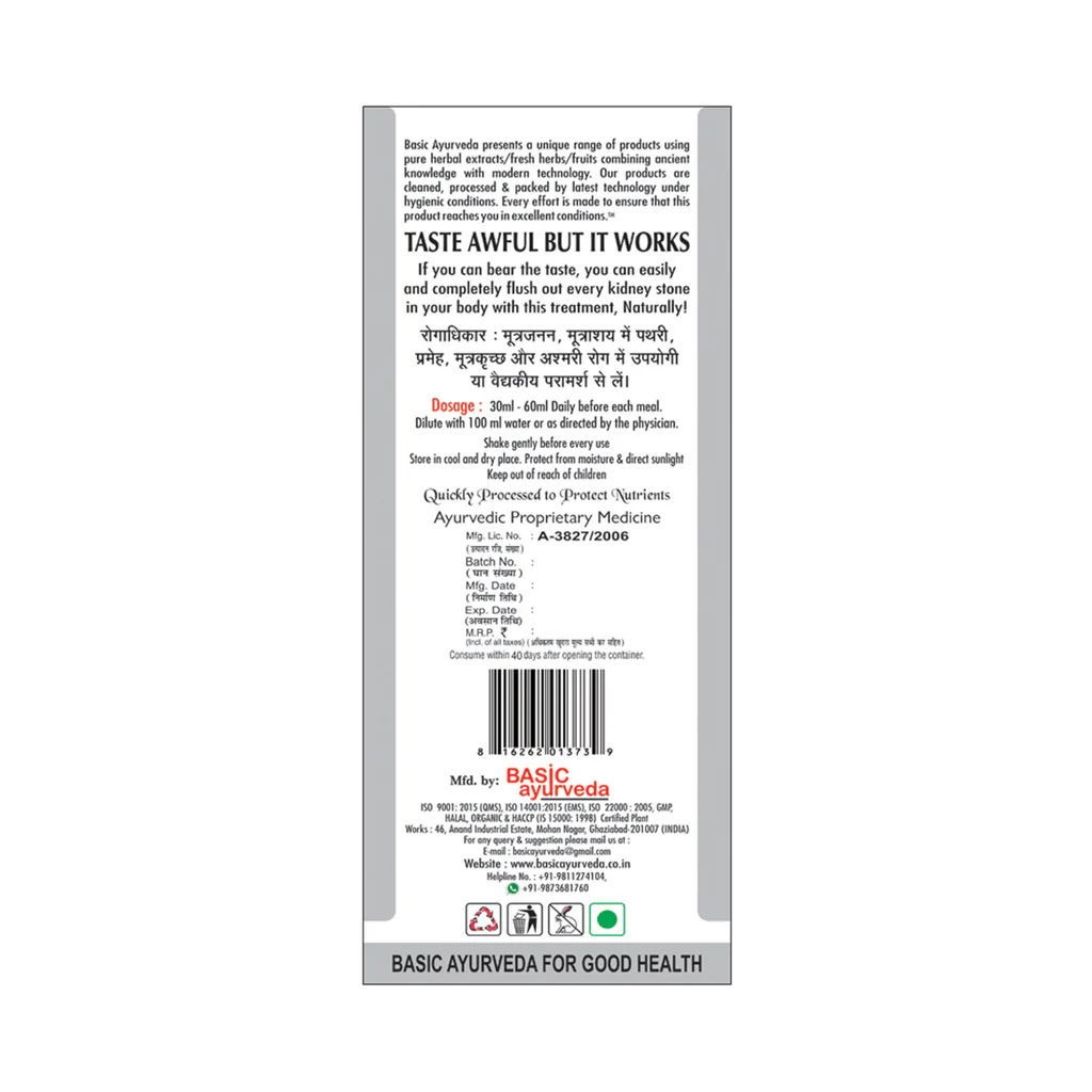 Basic Ayurveda Patdrill Drink (Special No Stone Drink) This herbal preparation helps in dissolving & excreting renal stones. It is also known for its beneficial effects in an individual suffering from various types of urinary disorders. Primarily used for the treatment of renal stones. It uses all-ayurvedic ingredients that dissolves kidney stones Contains diuretic properties and can be effectively used for the treatment of urinary disorders Relieves inflamed conditions and helps treat the renal infection Standard delivered 4-5 Business Days Express delivered 2-4 Business Days
