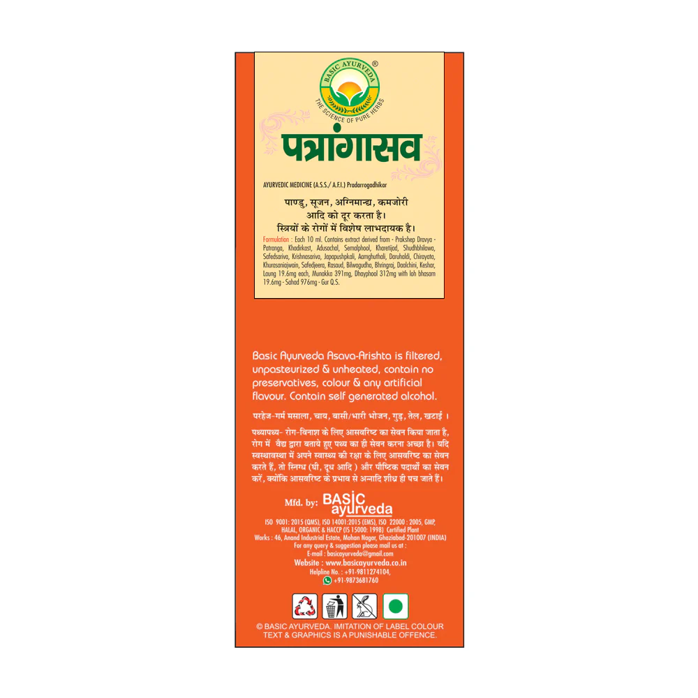 Basic Ayurveda Patrangasava is a potent ayurvedic medicine effective in the management of gynecological conditions such as heavy menstrual bleeding, leucorrhea, menorrhagia, and fever, etc. It also helps to correct hormonal imbalance and hemoglobin level. It helps to correct hormonal imbalance and hemoglobin level Used in the treatment of leucorrhoea and other period-related problems It acts as urinary antiseptic and astringent Effective in leucorrhea and svetapradara