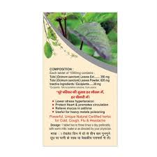 Basic Ayurveda Tulsi Tablet is enriched with the goodness of Holy Basil. It is known as the ‘’Mother Medicine of Nature’’ because of the many health benefits that it has. It has Kapha-balancing properties. It has anti-inflammatory and anti-allergic properties. It not only boosts immunity but also improves digestion. It protects from flu and provides relief from stress. Respiratory disorder Helpful for cold & cough Anti-stress Useful in eye disorder