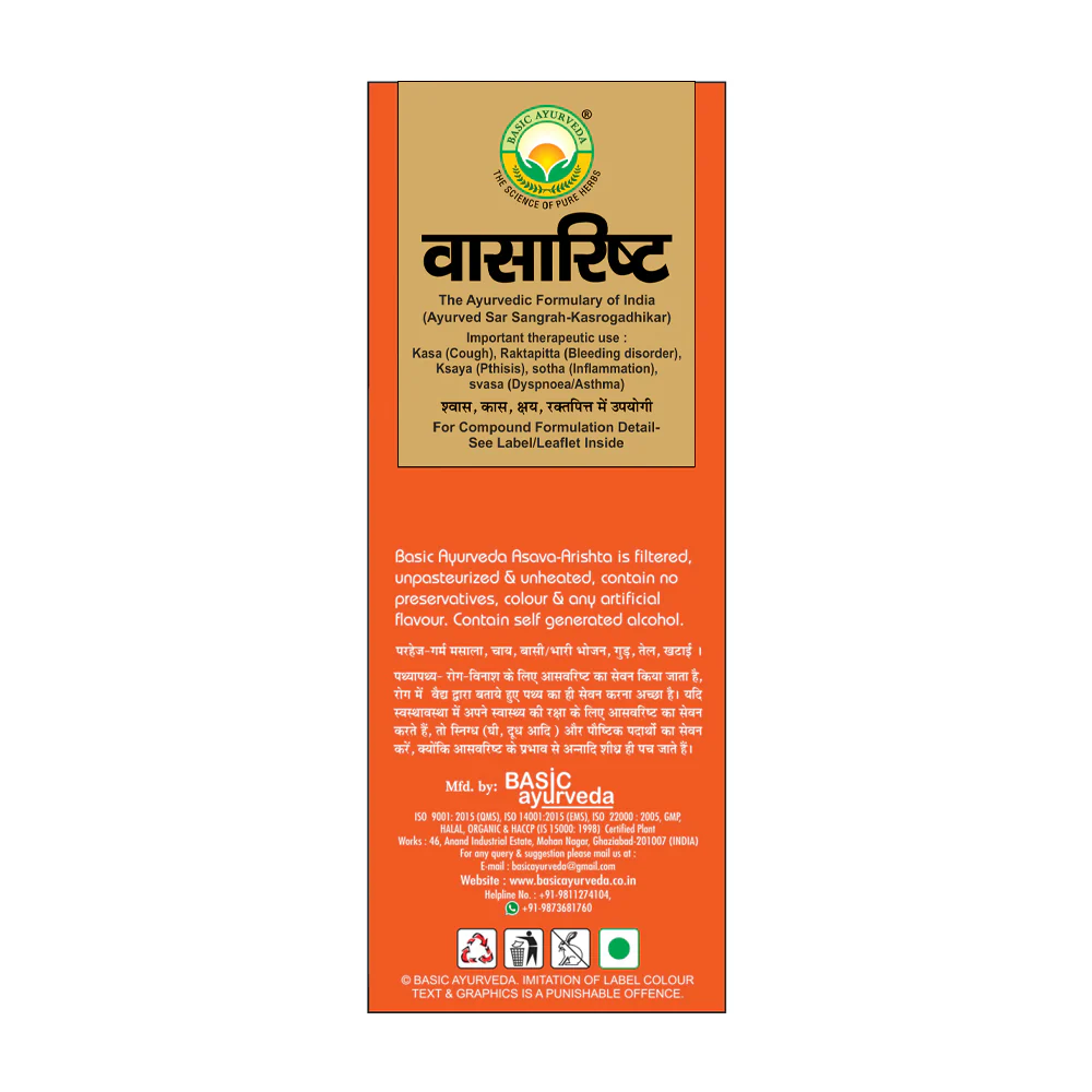 Basic Ayurveda Vasaristha is a famous polyherbal Ayurvedic medicine gifted with mucolytic and anti-asthmatic properties that aid in treating a myriad of respiratory disorders. It is widely used for treating several other respiratory conditions such as common cold, bronchitis, and sinusitis. It also has anti-asthmatic and coagulative properties which ease breathing in patients suffering from asthma and cures bleeding disorders like nose bleeding/epistaxis, hemoptysis. Pharyngitis. Laryngitis. Bronchitis. Asthma – it reduces wheezing, breathing trouble, and chest congestion. Cough. Upper respiratory infections. Common cold. Sinusitis.