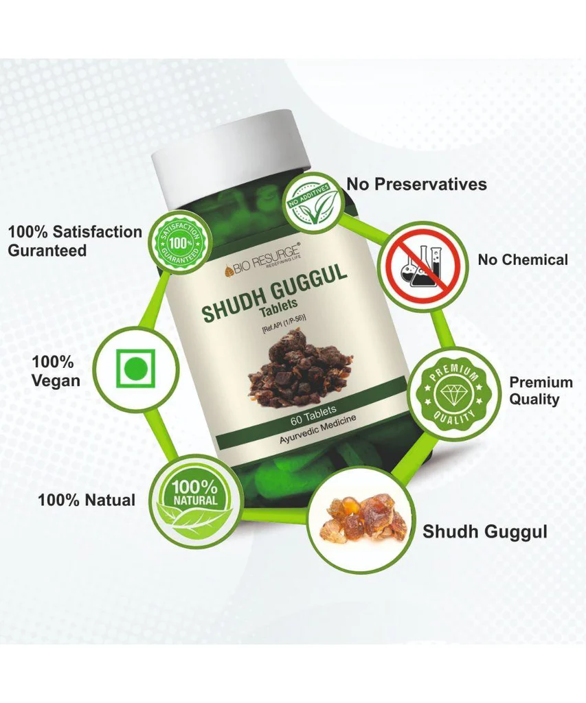 Bio Resurge Shudh Guggul Tablets for Skin Care & Acne | Manage Cholesterol UNIT SALE PRICE: ₹ 11.83 per Tablets Guggul has great anti-inflammatory properties helps treat acne, eczema, and other skin-related infections, and also helps in reducing cholesterol. Guggul Benefits: Helps in managing weight. Helps to manage cholesterol Supports healthy blood sugar levels. Useful for Thyroid function. Guggle has anti-inflammatory properties