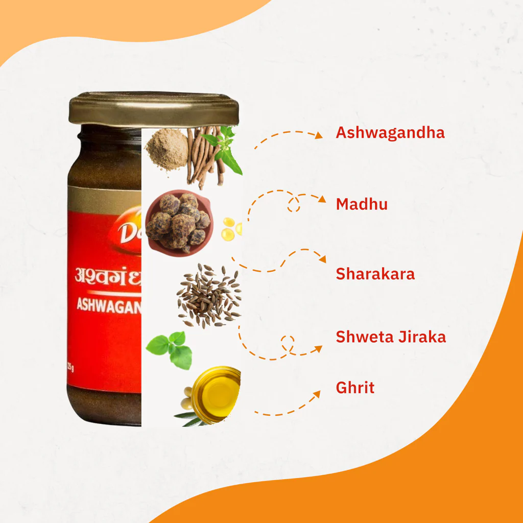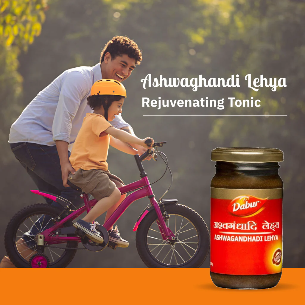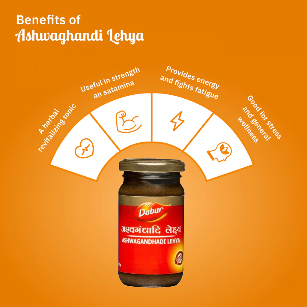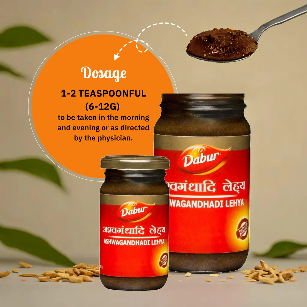 Dabur Ashwagandhadi Lehya is an Ayurvedic body building supplement that is considered a powerful aphrodisiac and nervine tonic. It is an Ayurvedic medicine for Stamina & Muscle Strength formulated using ayurvedic herbs as recommended by Ayurved in India, which helps fight tiredness, increases muscle strength and sexual vigour.