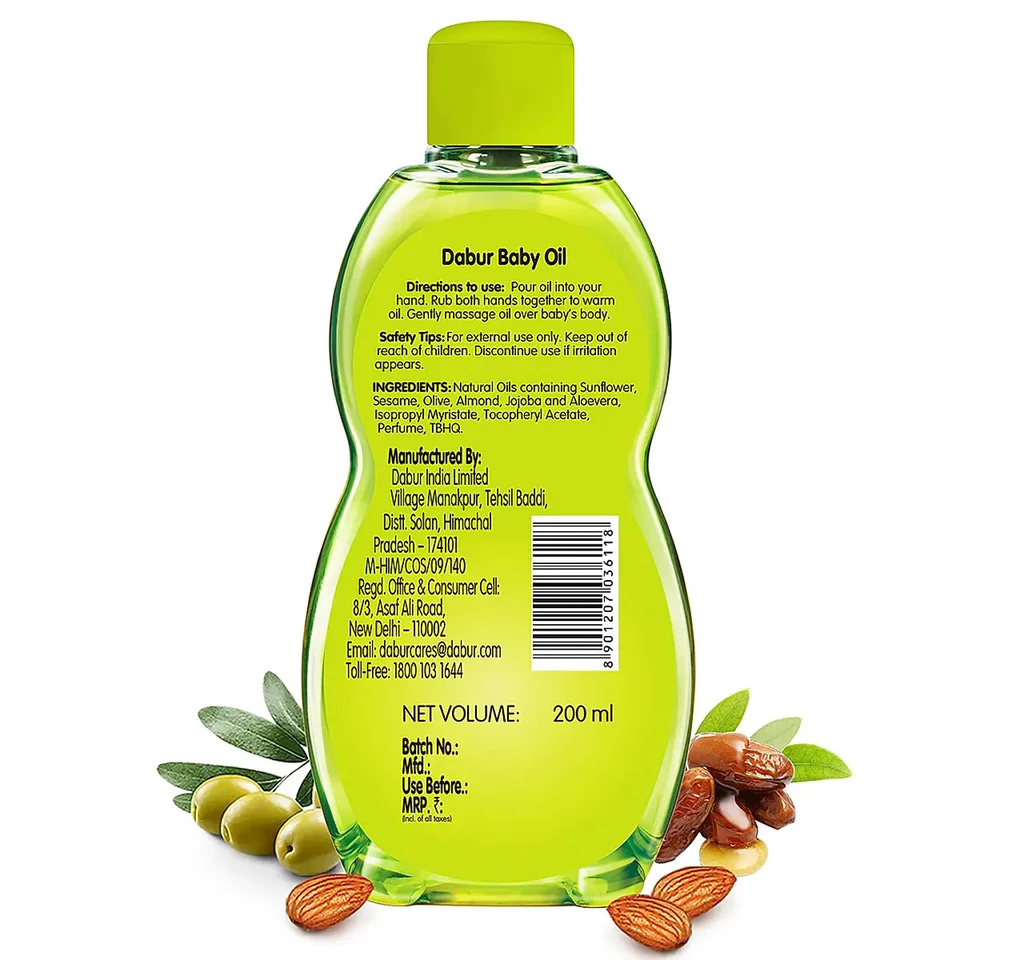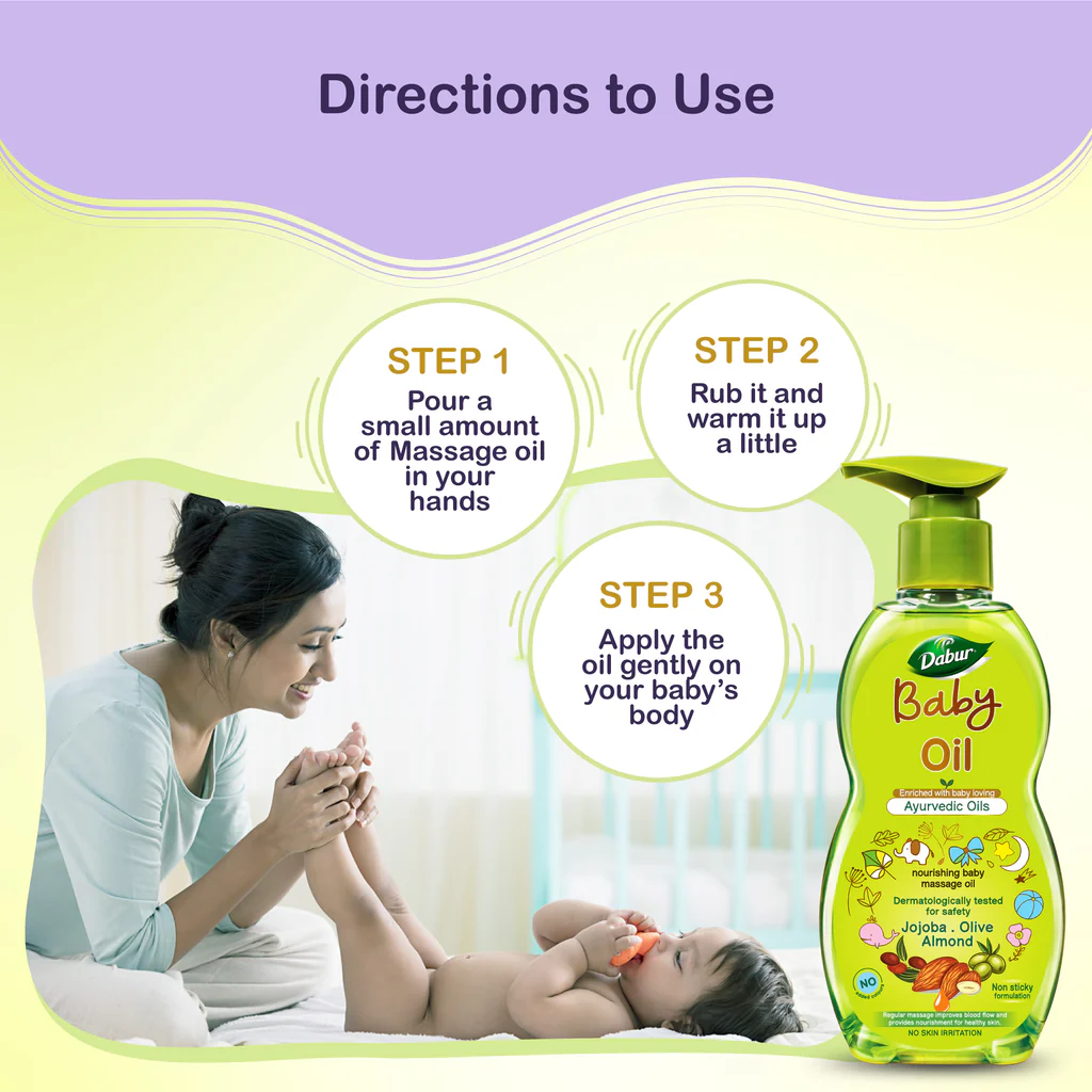 Dabur Baby Oil is enriched with baby loving ayurvedic herbs. It has power of Jojoba, Olive and Almond to provide nourishment and strength to your baby's skin without any harmful chemicals. It is dermatorlogically tested, hypoallergenic and mildness tested to ensure nourishment without compromising your baby's safety.