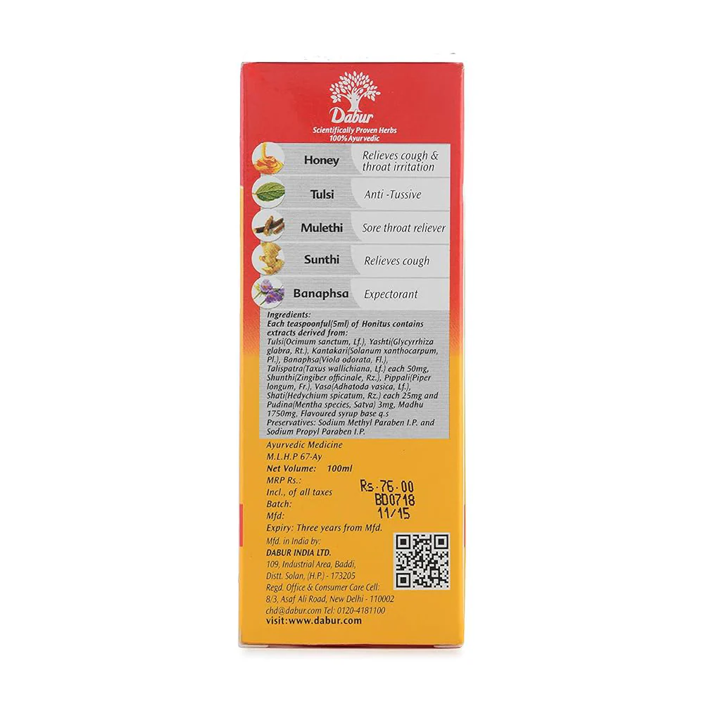 Dabur Honitus is India's No.1 Ayurvedic Cough Syrup. It is Clinically Tested for Fast & Effective Relief from Cough & Sore Throat in just 15 minutes. Its 100% Ayurvedic non-drowsy formula is made up of ingredients like Honey, Tulsi, Mulethi, Shunthi & Banapsha. It is safe to consume, does not contain any alcohol and is non-addictive.