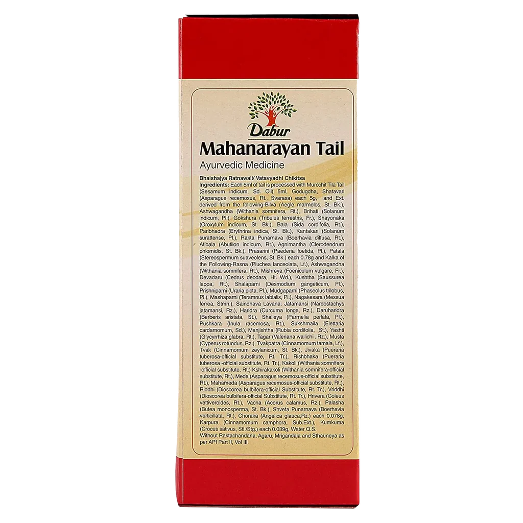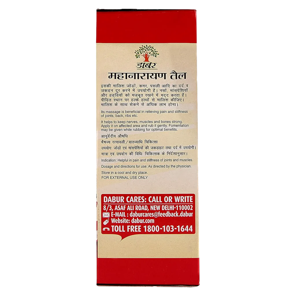 Dabur Mahanarayan Tail is an Ayurvedic preparation that can be used to massage the joints and back to relieve pain and stiffness of these areas. It helps to keep the nerves, muscles, and bones strong. Regular massage with the oil helps reduce joint pain and stiffness.