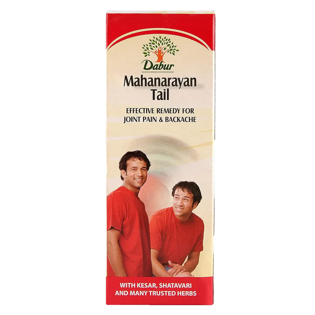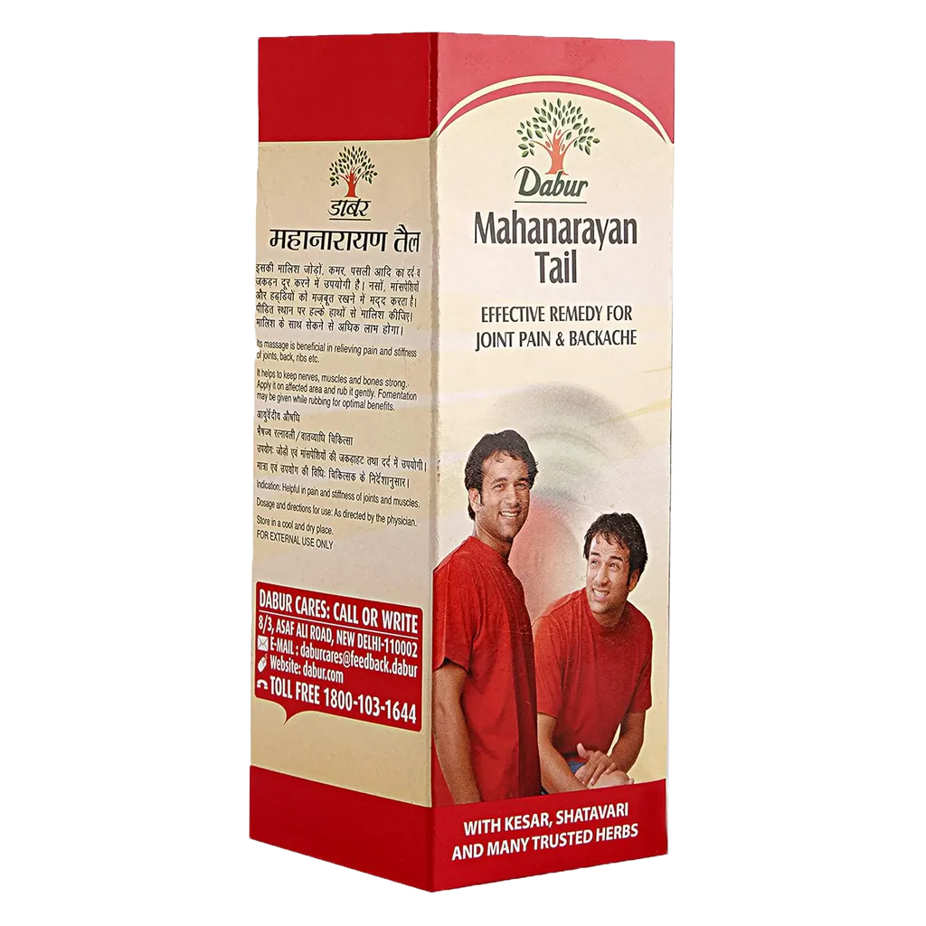 Dabur Mahanarayan Tail is an Ayurvedic preparation that can be used to massage the joints and back to relieve pain and stiffness of these areas.