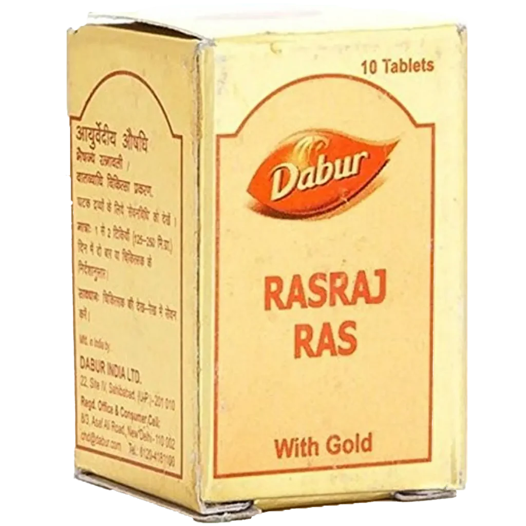 Dabur Rasraj Ras with Gold Tablet contains a potent combination of Ayurvedic ingredients, which are helpful in treating