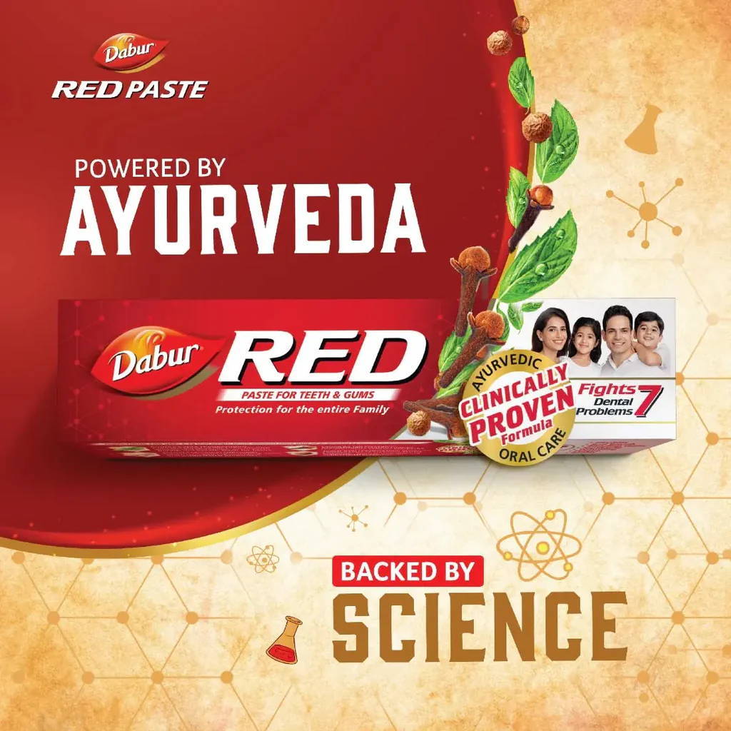 DABUR RED PASTE has a clinically proven formula that fights against 7 DENTAL PROBLEMS: 1) Toothache, 2)Cavities, 3) Plaque, 4) Germs, 5) Bad Breath, 6) Yellowing, and 7) Bleeding Gums.