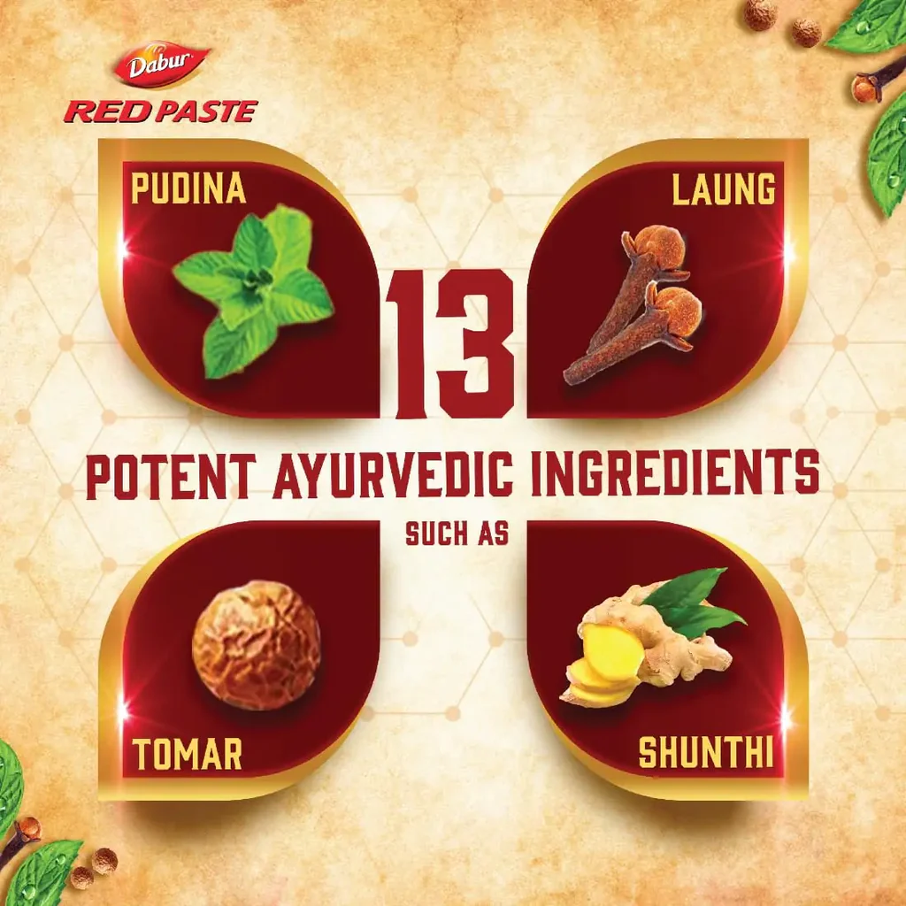 DABUR RED PASTE has a clinically proven formula that fights against 7 DENTAL PROBLEMS: 1) Toothache, 2)Cavities, 3) Plaque, 4) Germs, 5) Bad Breath, 6) Yellowing, and 7) Bleeding Gums. It is fluoride free and made with 13 potent ayurvedic ingredients including Pudina Satva that provides fresh breath, Laung ka Tail that relieves toothache, Shunthi that has anti-inflammatory and antibacterial