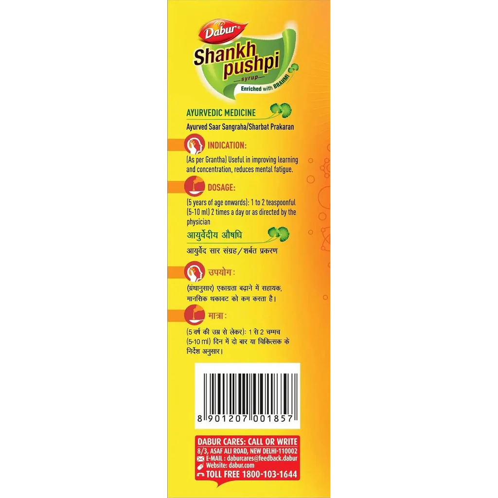Dabur Shankhpushpi Syrup is a natural brain tonic and is also called medya rasayana. This ayurvedic medicine contains Brahmi and Shankhapushpi as the main ingredients. This is useful in improving concentration and learning.