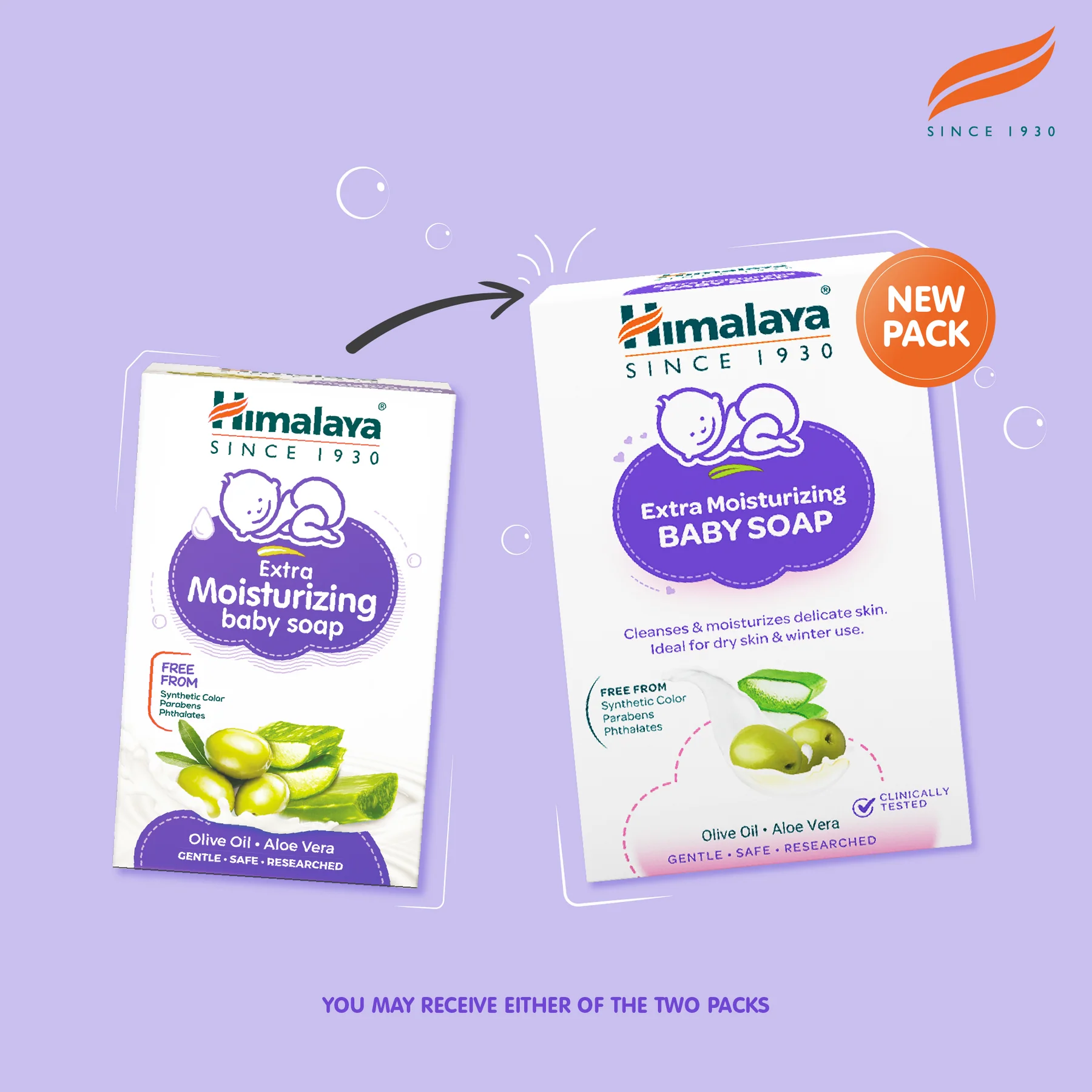 Himalaya Extra Moisturizing Baby Soap gently cleanses and helps prevent post bath dryness, leaving baby’s skin soft and smooth. The soap is enriched with the goodness of herbs with extra-moisturizing properties. Aloe Vera is rich in Vitamin E and helps soothe, nourish, and protect skin, while Almond Oil, Olive Oil, and Milk help keep skin soft, smooth, and moisturized. This soap is ideal for use in winters. INGREDIENTS: Almond Oil, Aloe Vera, Olive Oil, Milk. Additional information: - Almond Oil has humectant property, which replenishes the lost moisture and ensures moisture balance. - Ideal for use in winter. Directions for Use: Wet baby's face and body. Apply Himalaya Extra Moisturizing Baby Soap generously with your hands. Gently work up a lather, rinse, and pat dry. Free from: - Parabens - Phthalates - Synthetic Color