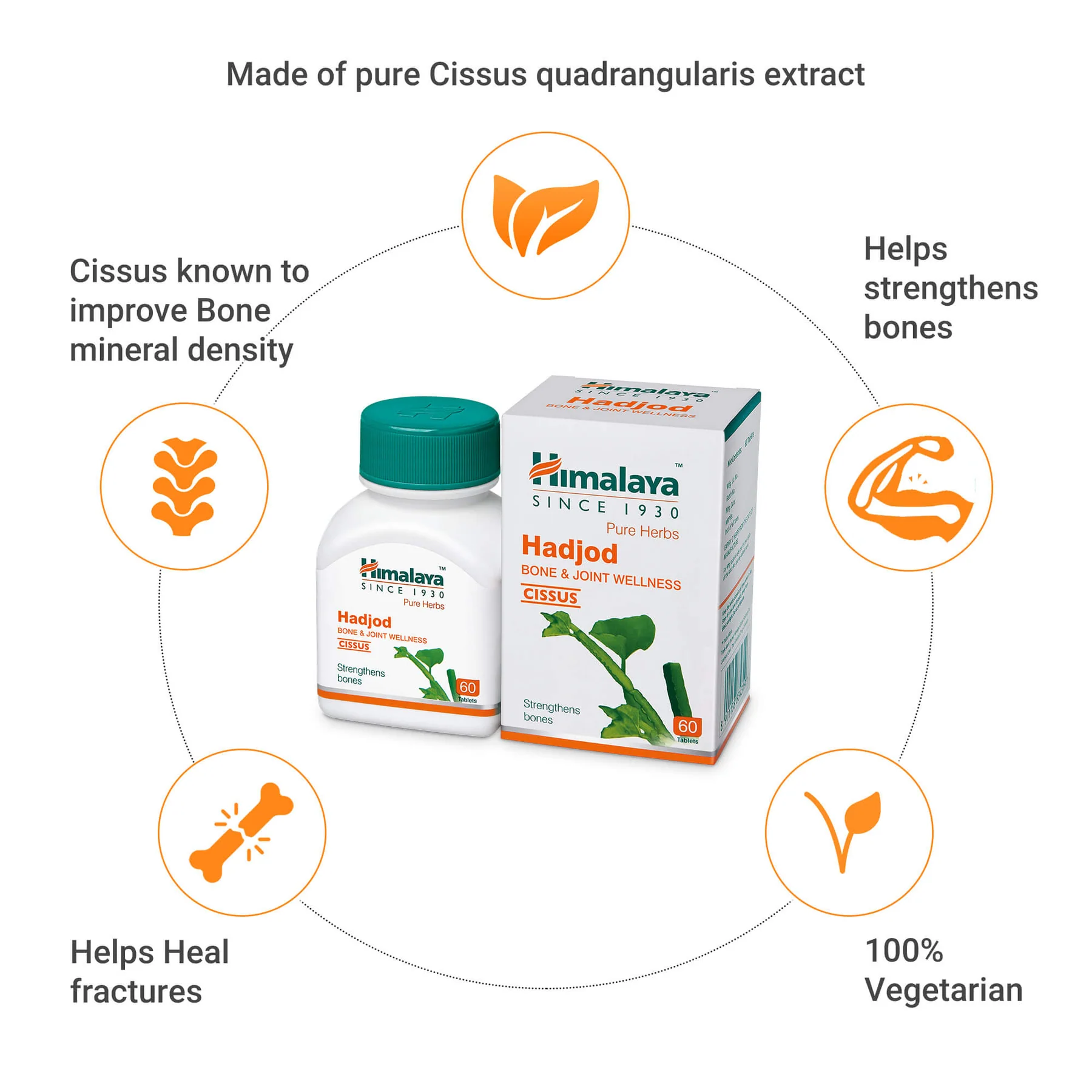 Hadjod accelerates the healing of fractures by supporting the delicate, healthy equilibrium between bone restoration and bone formation. INGREDIENTS: Asthisamhara Additional information: Composition: Each tablet contains: Asthisamhara (Cissus quadrangularis) stem extract - 250 mg Good to Know: -100% vegetarian. -Free from sugar, artificial colors, artificial flavors, preservatives. Special Instructions: -It is advisable to consult your physician before you start using the product in these situations: 1.Pregnancy 2.Breastfeeding 3.In Conditions which require special medical care -Specific contraindications that have not been identified -Please consult your physician if symptoms persist. Directions for Use: 2 tablets twice daily or as directed by your physician.