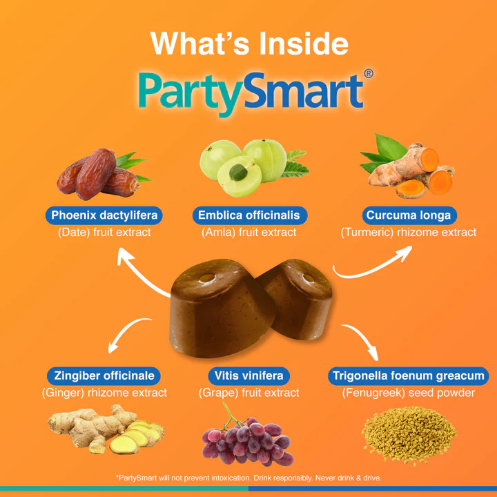Himalaya PartySmart is a clinically proven herbal formulation that helps prevent hangovers. PartySmart Gummies help speed up alcohol processing and reduce hangover symptoms so you feel refreshed. These gummies are made with herbal extracts that support liver detox and natural recovery. PartySmart Gummies can be taken before, during, or after consuming alcohol to ensure you wake up fresh the morning after. INGREDIENTS: Phoenix dactylifera (Date) fruit extract, Curcuma longa (turmeric) rhizome extract, Vitis vinifera (grape) fruit extract, Emblica officinalis (amla) fruit extract, Zingiber officinale (Ginger) rhizome extract & Trigonella foenum greacum (Fenugreek) seed powder. Additional information: Key Ingredients Composition and Function/Benefits: Phoenix dactylifera (Date) fruit extract, Curcuma longa (turmeric) rhizome extract, Vitis vinifera (grape) fruit extract, Emblica officinalis (amla) fruit extract, Zingiber officinale (Ginger) rhizome extract & Trigonella foenum greacum (Fenugreek) seed powder. The ingredients in PartySmart Gummies are expected to ameliorate effects of alcohol holistically. The ingredients are expected to target the following physiological factors contributing to alcohol hangover. - Gastric irritation, inflammation, and delayed gastric emptying caused by alcohol, which often contributes to abdominal discomfort, nausea, and vomiting. - Alcohol metabolites and their effects. - Oxidative stress induced by alcohol stresses the bodily systems, especially the liver. Directions for Use: Two Gummies per serving = 1 pillow pack. Take any time before, during, or after consuming alcohol. Claims: - 100% herbal actives. - Supports the liver. - Safe and effective. Note: PartySmart will not prevent intoxication. Party responsibly.