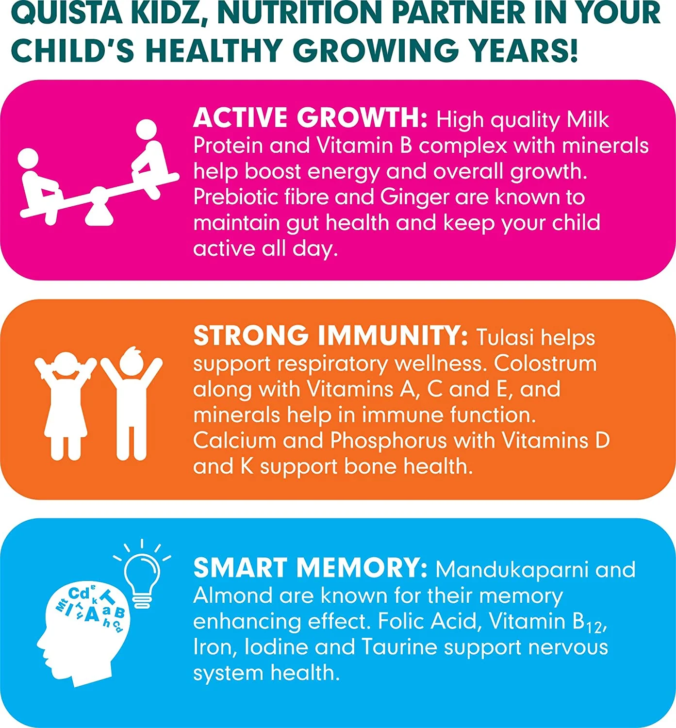 A child's formative years are critical for rapid development in their physical, cognitive, and socio-emotional domains. Quista kidz offers a holistic approach to help achieve vital milestones in your child's life. This scientifically researched nutritional supplement is the amalgamation of traditional ingredients and vital nutrients that support your child’s overall development and well-being. INGREDIENTS: Tulasi, Colostrum, 100% Milk Protein, Ginger, Gotu Kola, Almond Additional information: Directions for Use Add 1-2 scoops of Quista kidz powder to 200ml of lukewarm or cold milk. Stir briskly until mixed well. Available in vanilla and chocolate flavors FOOD FOR SPECIAL DIETARY USE- For children at nutrition risk above 3 years of age. NOT FOR MEDICINAL USE. Not for children with lactose intolerance. Not for parenteral use. This product is not an infant milk substitute or infant food. Can be taken with or without the medical advice of a health care professional. Allergen Statement: Contains milk ingredients and lecithin (soy). 100% VegetarianThis is a Vegetarian product.