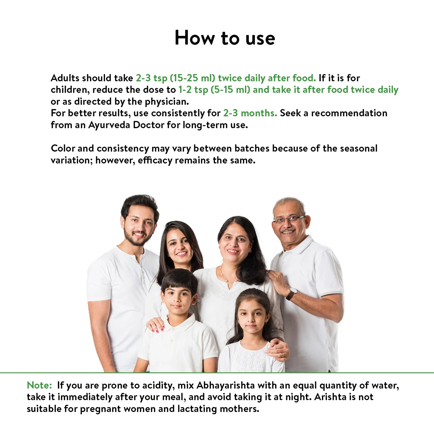 Abhayarishtam is a traditional Ayurvedic herbal tonic known for its digestive health benefits. Made from the powerful herb Haritaki (also called Abhaya), this liquid formulation has been used for centuries in Ayurveda to support and maintain a healthy digestive system. It is particularly valued for its ability to improve digestion, promote regular bowel movements, and detoxify the body. Abhayarishtam combines the natural healing properties of herbs and fermentation, making it a gentle yet effective remedy for digestive discomfort and overall wellness. Helps manage flatulence, bloating, indigestion, and constipation. Cleanses and detoxifies the gut. Supports regular bowel movements. Beneficial in managing discomfort associated with piles, fistula, and fissures.