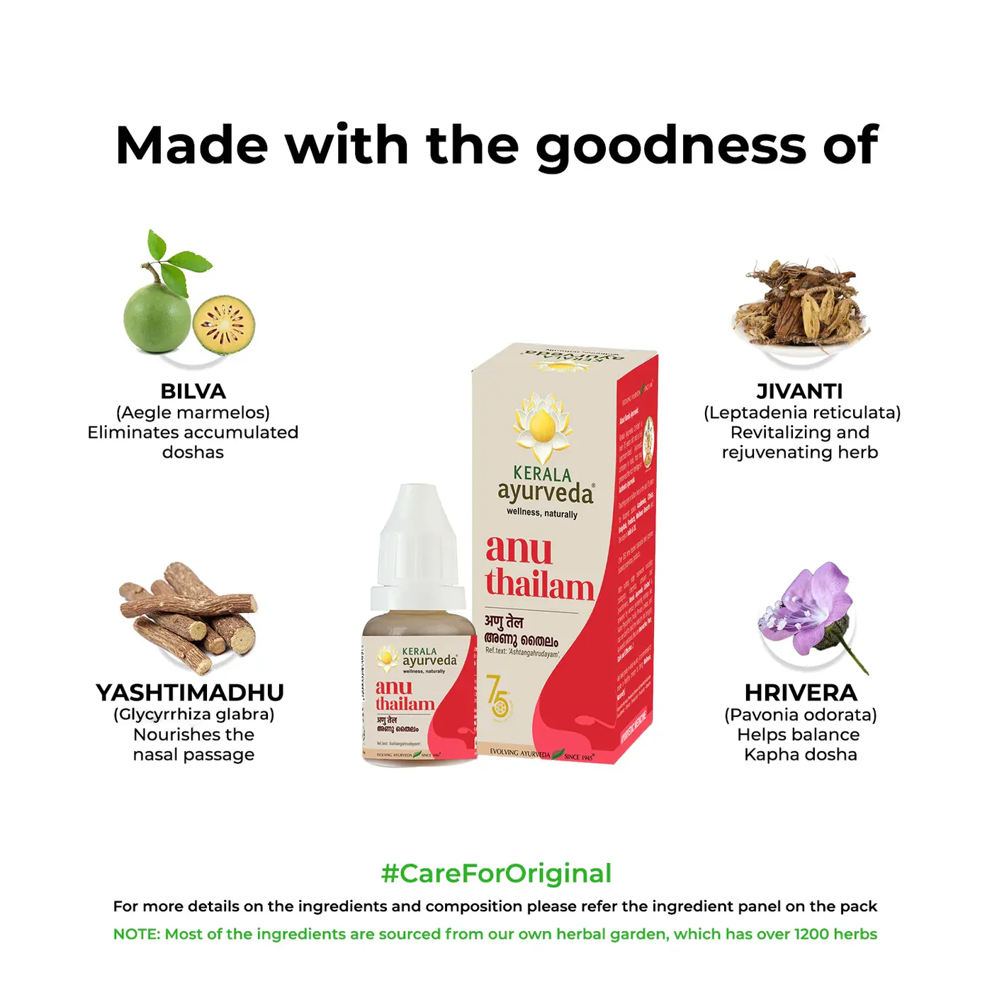 Nostrils are known as Shirodhara or the gateway to the head in Ayurveda. The nose is also the entry point of the vital breath or Prana vayu, which is crucial in maintaining vitality and mental clarity. According to Ayurveda, instilling herbal oils or Nasya is one of the essential holistic self-care practices that encourages healthy Prana flow and internal detoxification. Nasya helps to lubricate the nasal passages and clean out excess mucus from the sinuses. This helps reduce the frequency of sinusitis, allergies, and nasal congestion. Kerala Ayurveda Anu Thailam is made with Kapha balancing ingredients such as Leptadenia or Jivanti, Liquorice or Yashtimadhu, Fragrant Swamp Mallow or Hrivera & Indian bael or Bilva, and other herbs processed in goat’s milk and sesame oil. It helps clear the accumulated doshas from the nasal passage and enables you to breathe better!