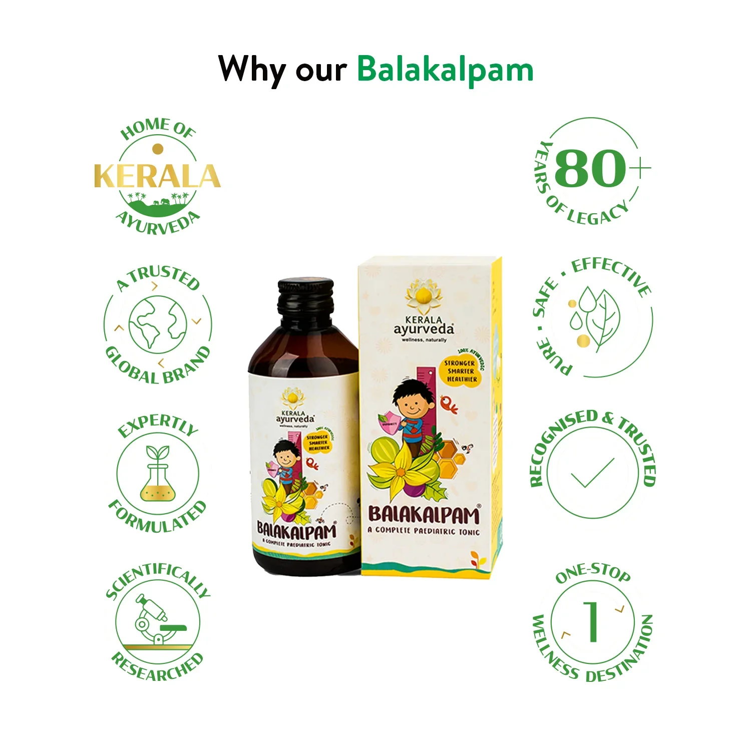 Balakalpam syrup is a pleasant-tasting, complete herbal tonic for children that helps improve digestion, immunity, and overall health. It is a safe, non-addictive tonic that is beneficial for respiratory and digestive conditions in children. Enhances immunity, digestion, and overall health. Beneficial in common illnesses such as fever and cold. Helps relieve abdominal pain, colic spasm, regurgitation, and constipation. Promotes growth in infants and children.